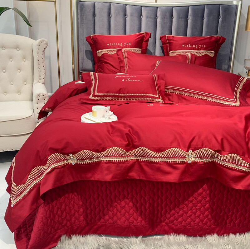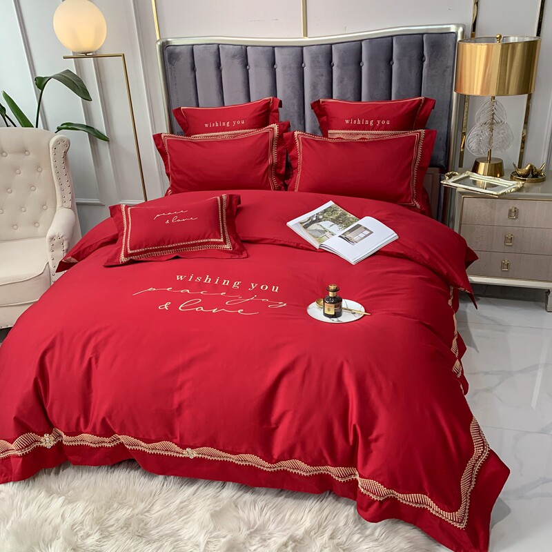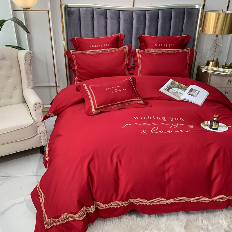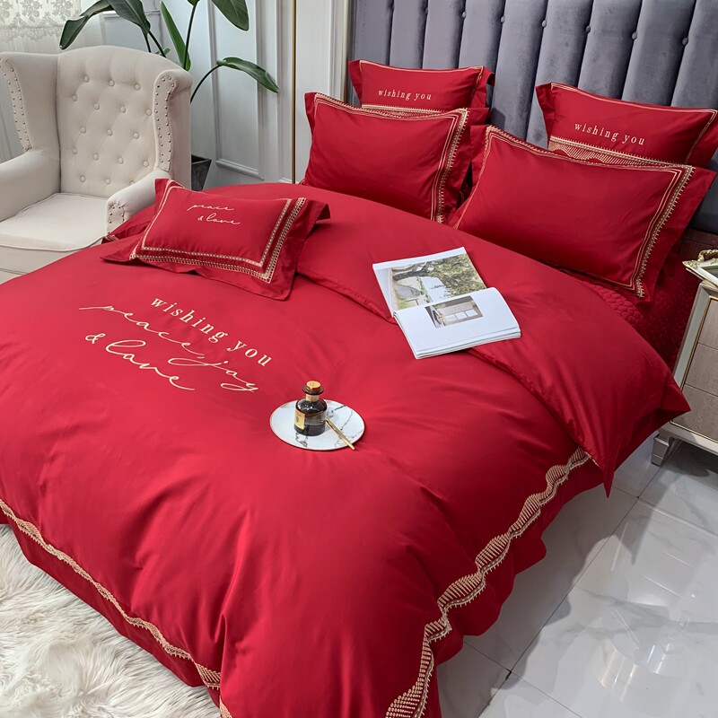 结婚四件套全棉高档长绒棉新婚嫁床单真丝刺绣被套大红色床上用品