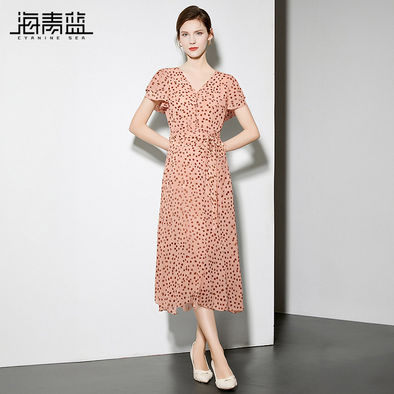 海青蓝 连衣裙夏女2025新款女装中长款时尚气质高级短袖波点裙子