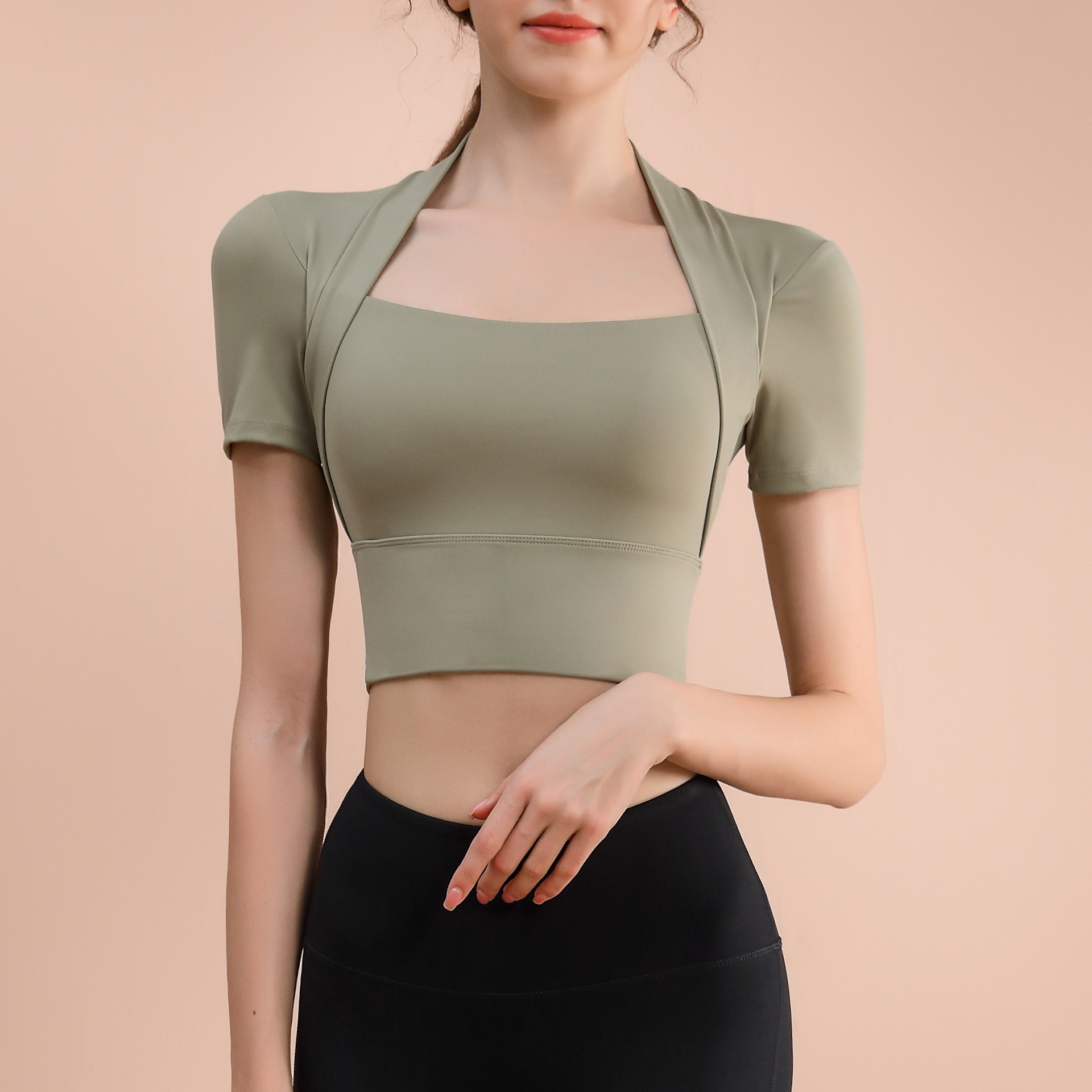 运动上衣女短款露脐带胸垫健身跑步T恤紧身透气裸感瑜伽服短袖