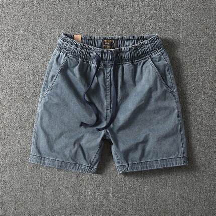 夏季休闲复古四分牛仔短裤男松紧腰露膝盖水洗纯棉做旧慢跑三分裤