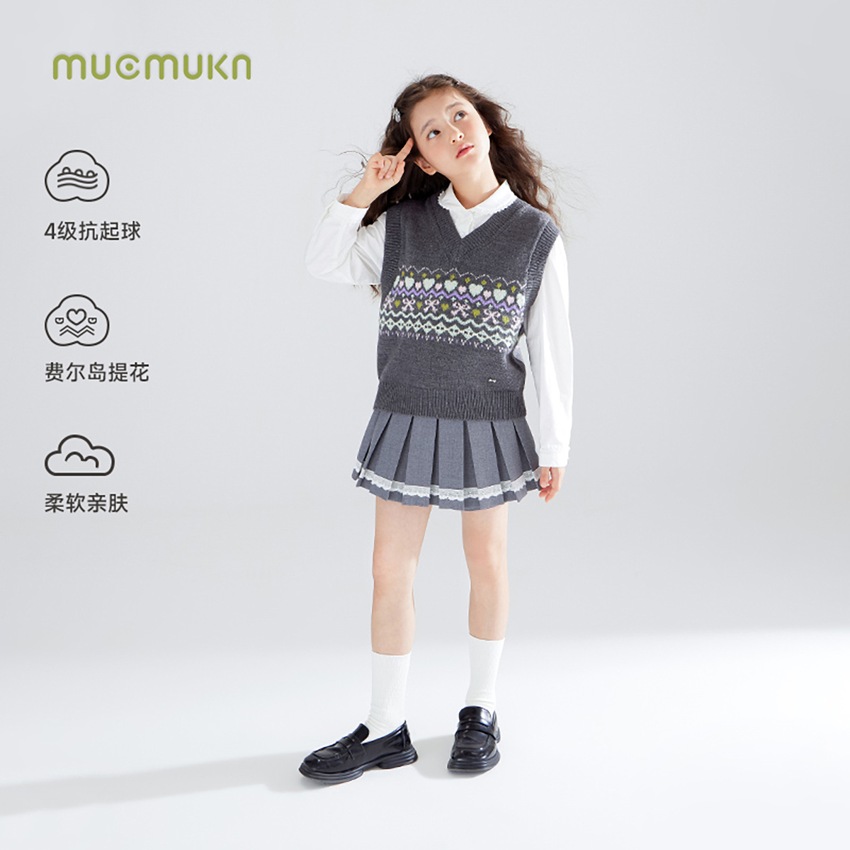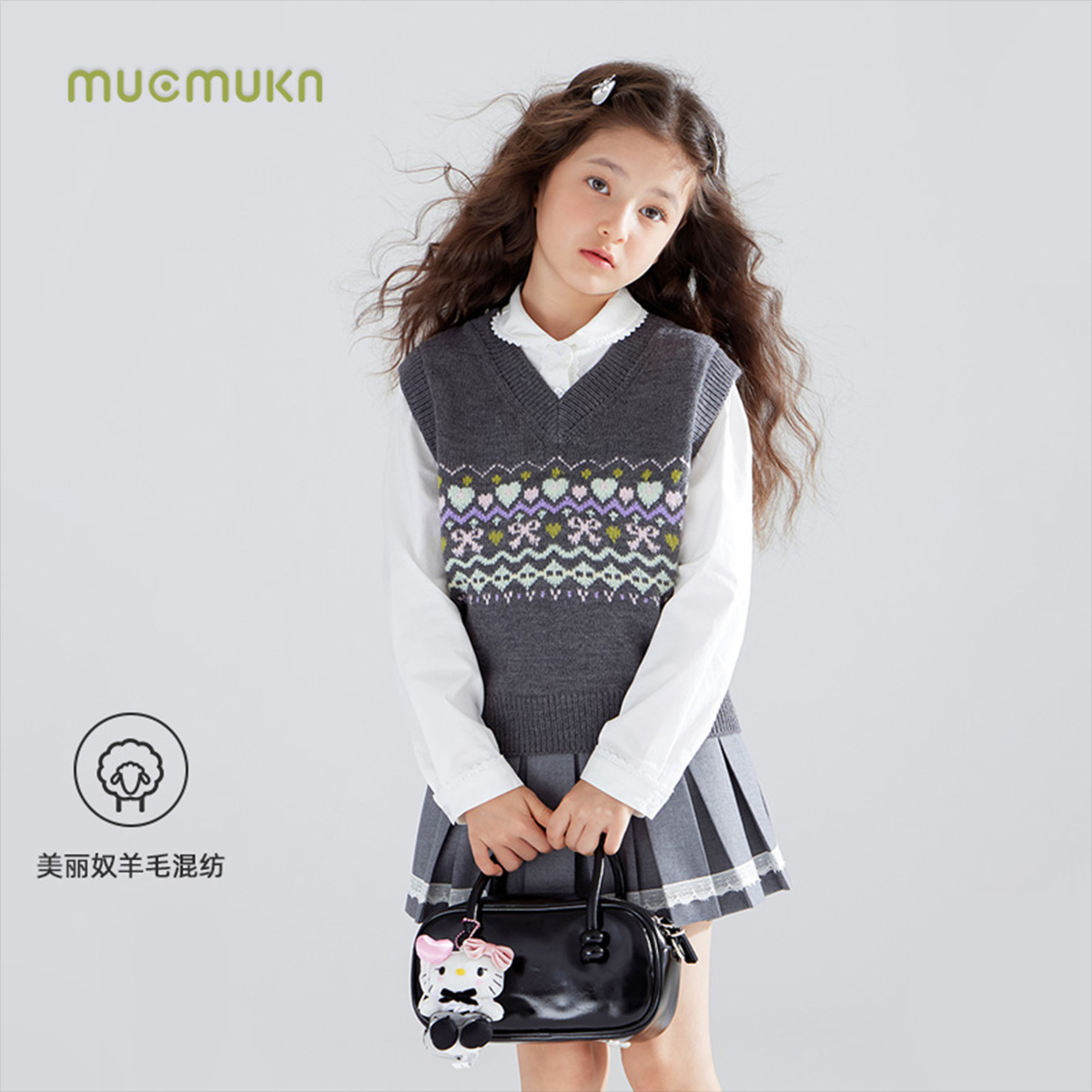 【宁儿粉丝专享】毛衣背心美利奴羊毛混纺女童蝴蝶结提花毛针织衫