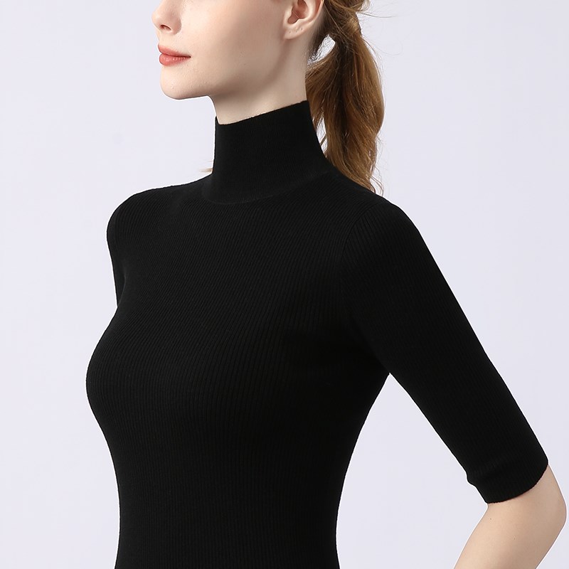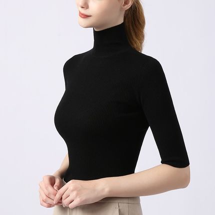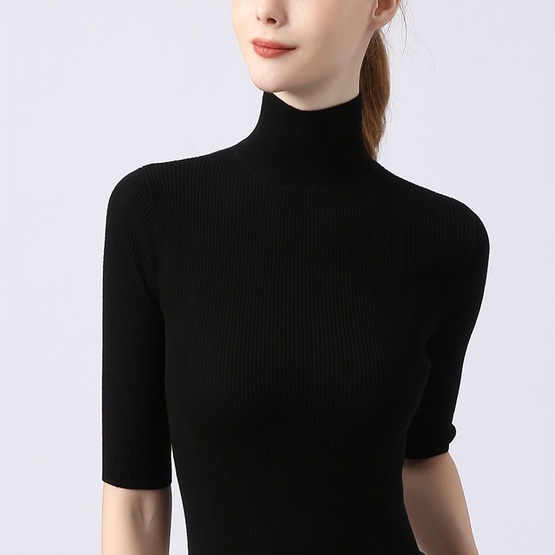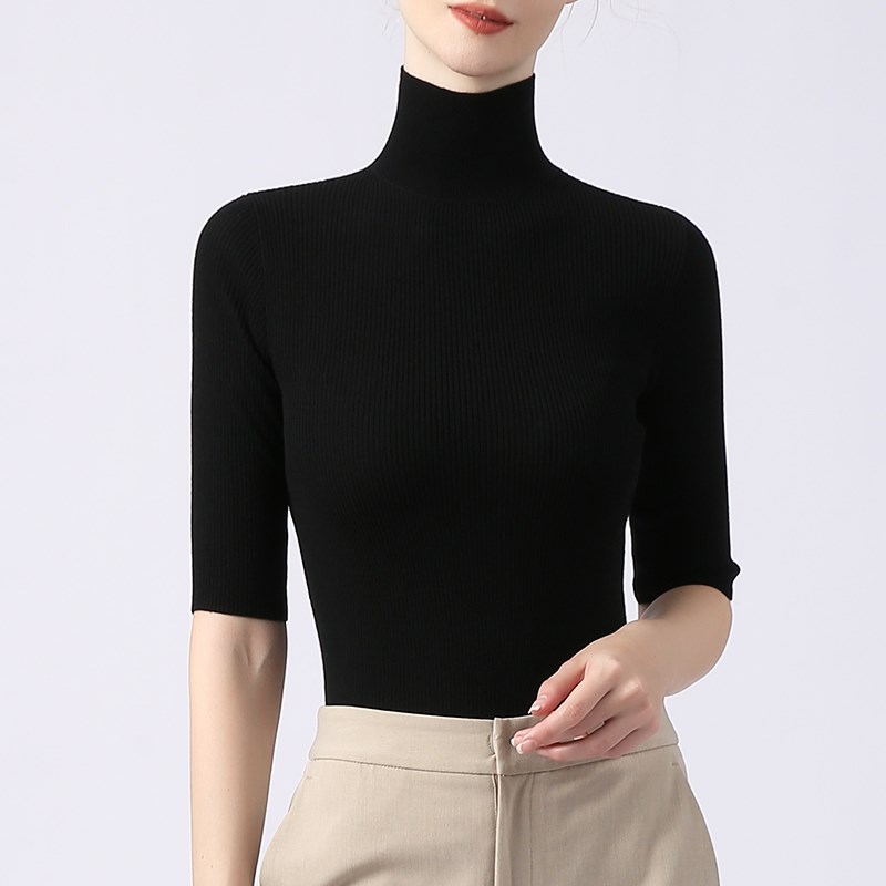 高领短袖针织衫女半袖螺纹上衣纯色春秋紧身薄款修身打底衫黑线衣