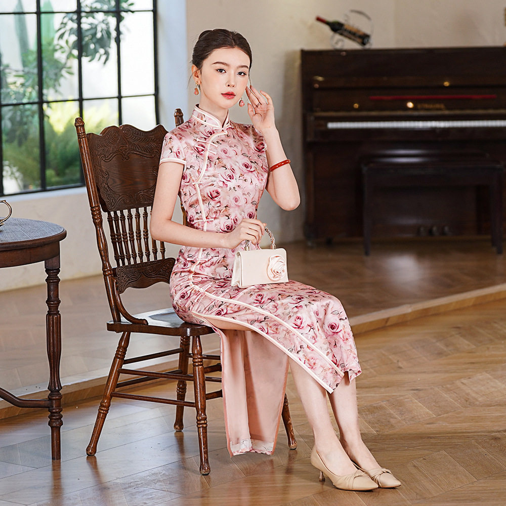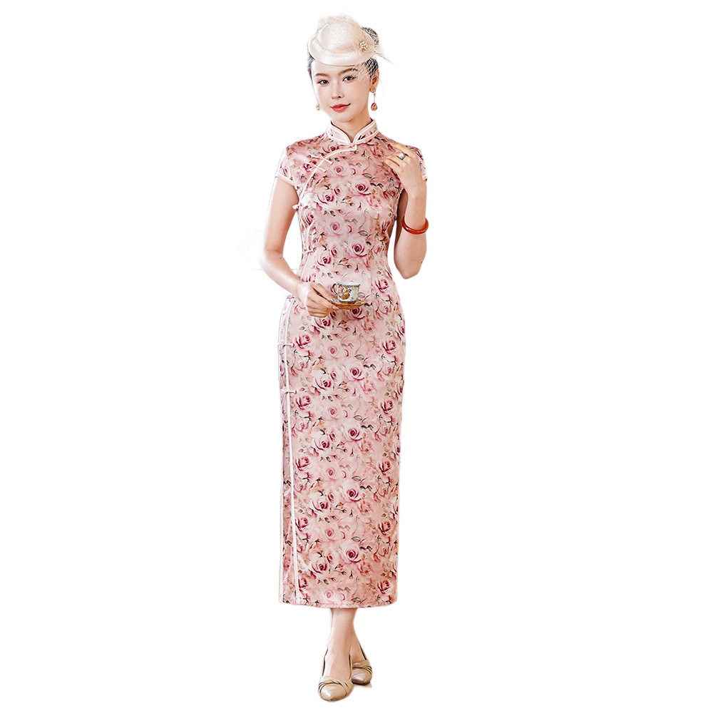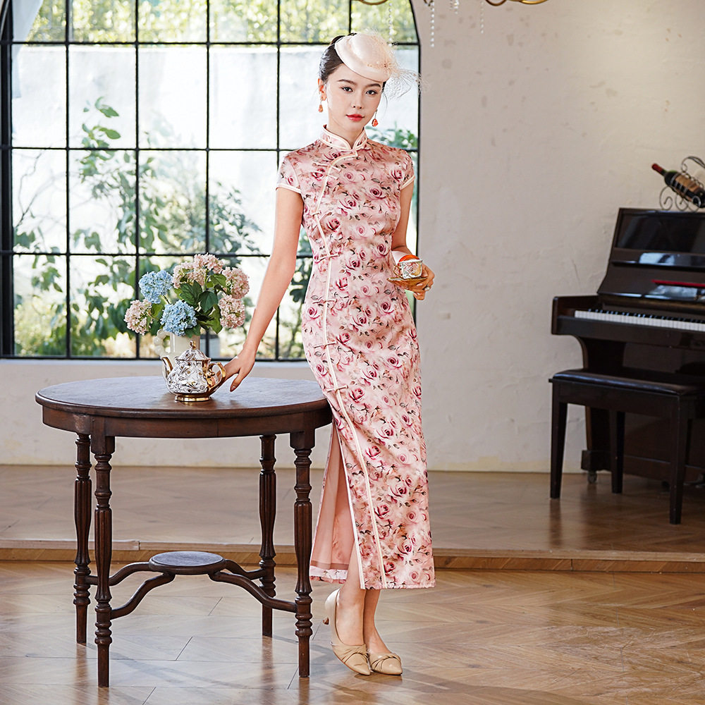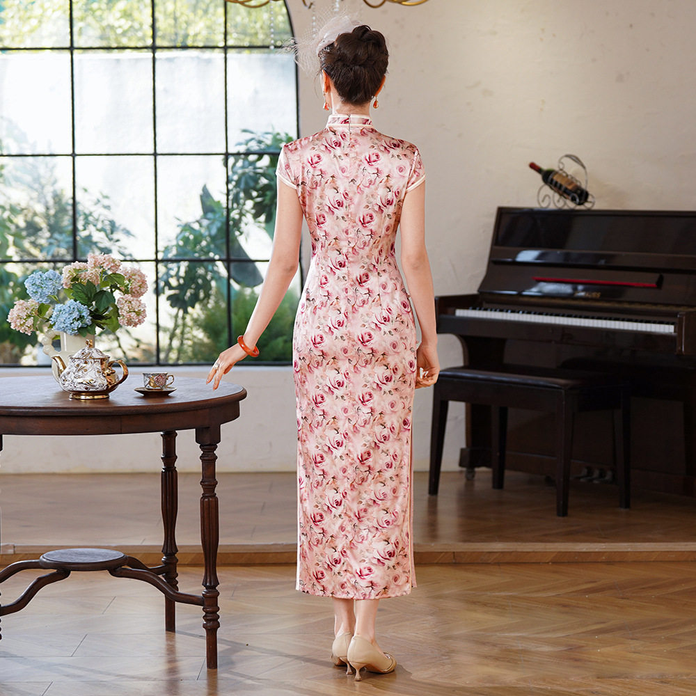 2026春装新款中式浪漫玫瑰印花真丝桑蚕丝长款旗袍礼服裙子连衣裙