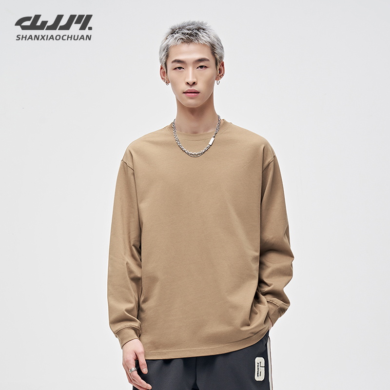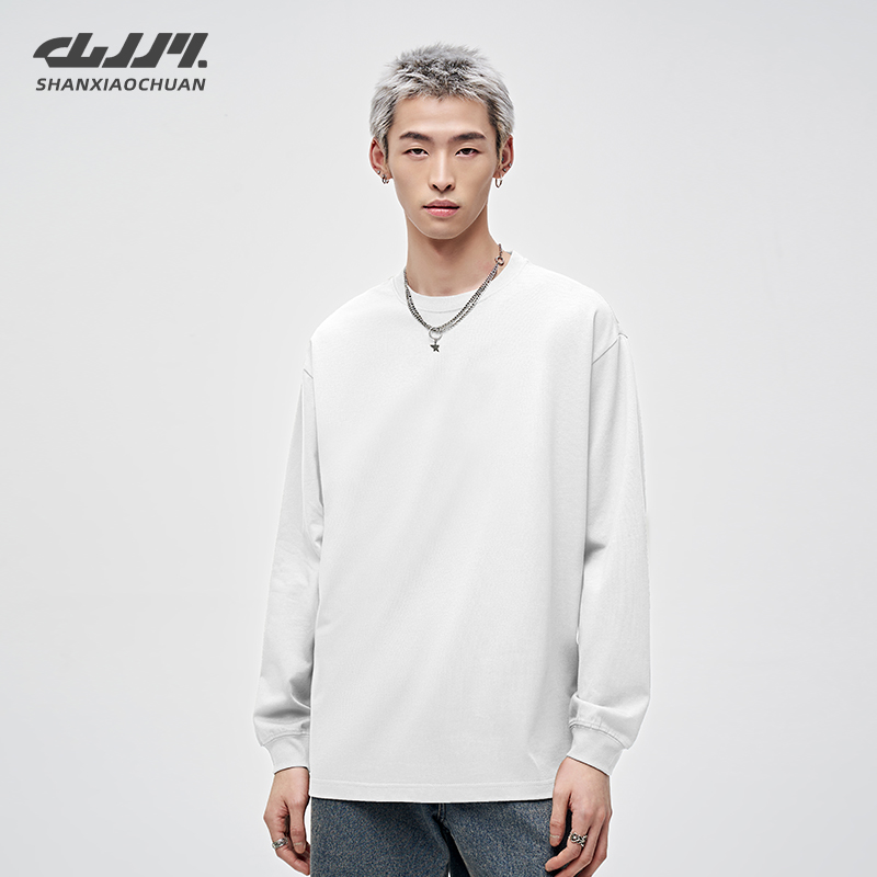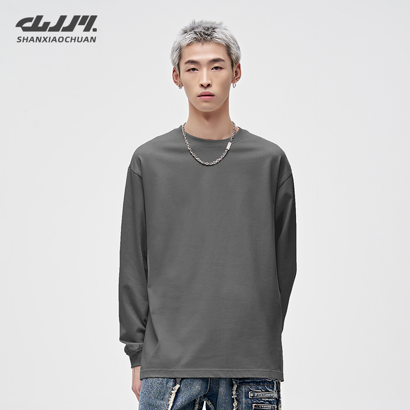 山小川美式纯棉黑色长袖T恤男女宽松打底衫圆领重磅纯色男生内搭
