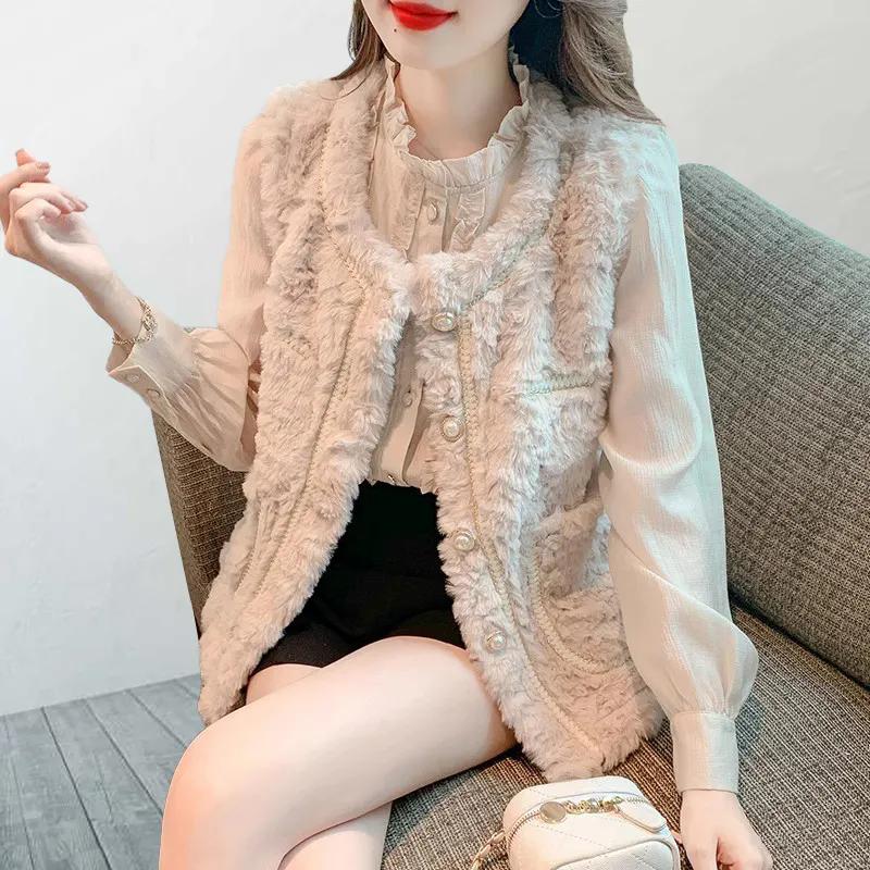 羊羔毛马甲女短款圆领皮毛一体外穿马夹坎肩2023秋冬新款无袖外套