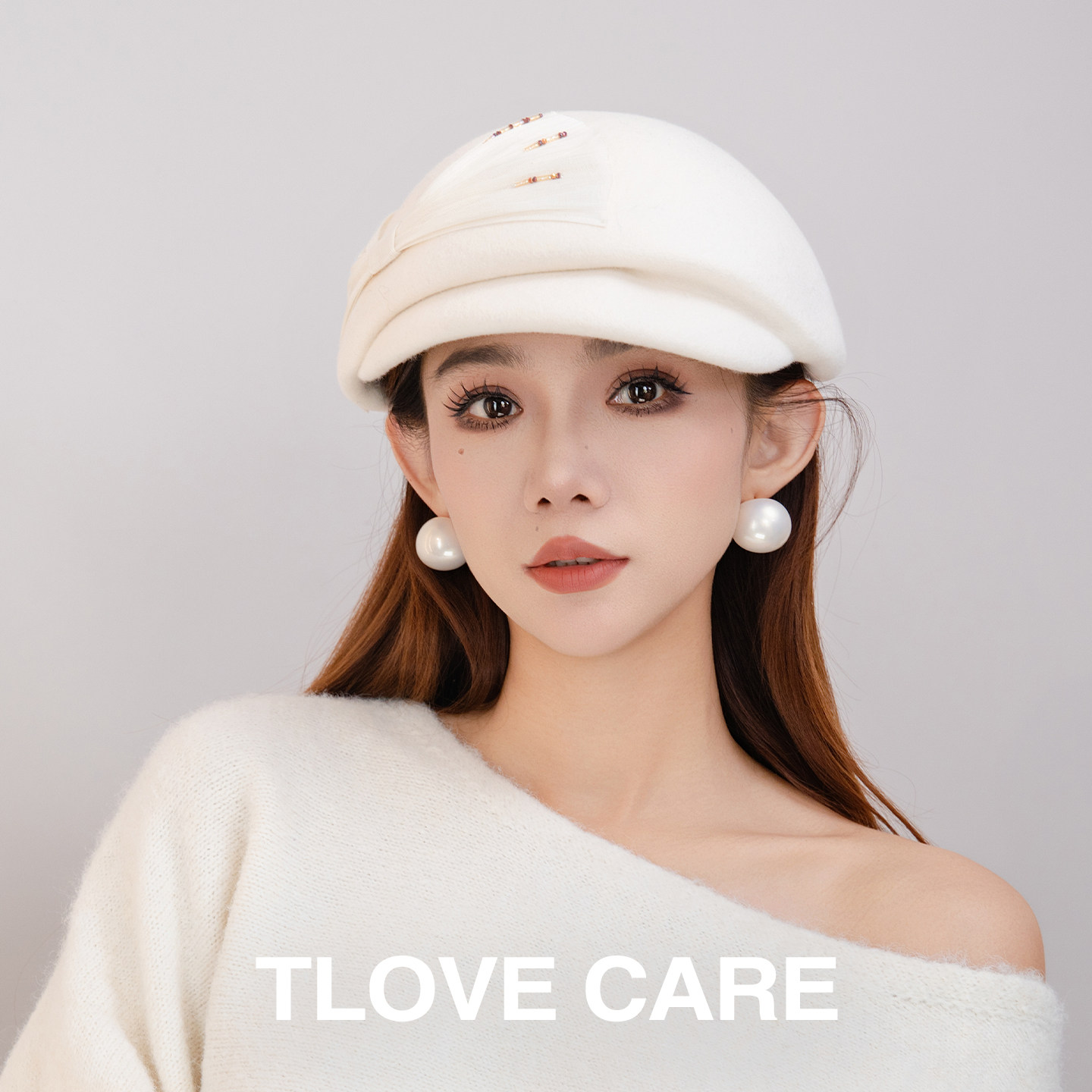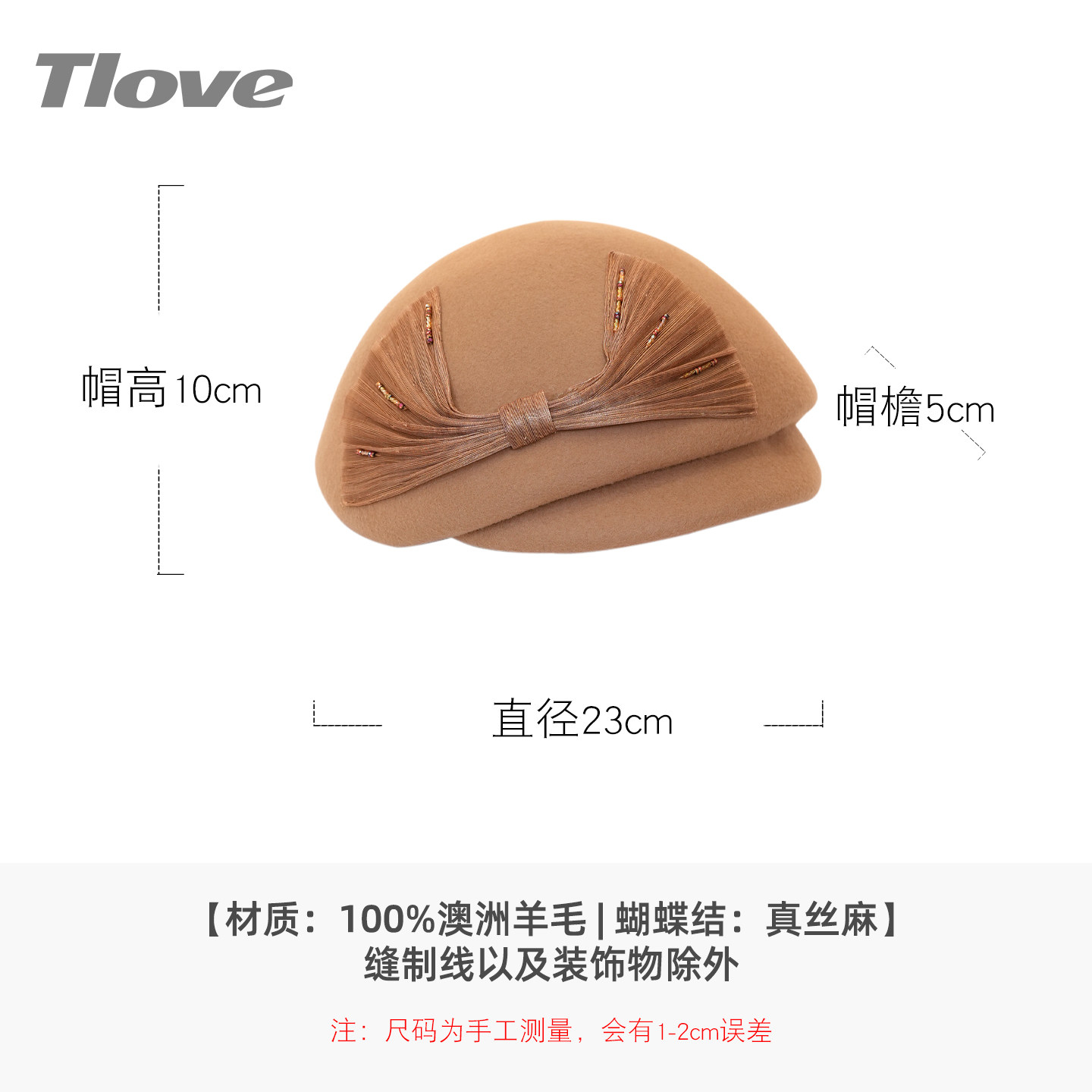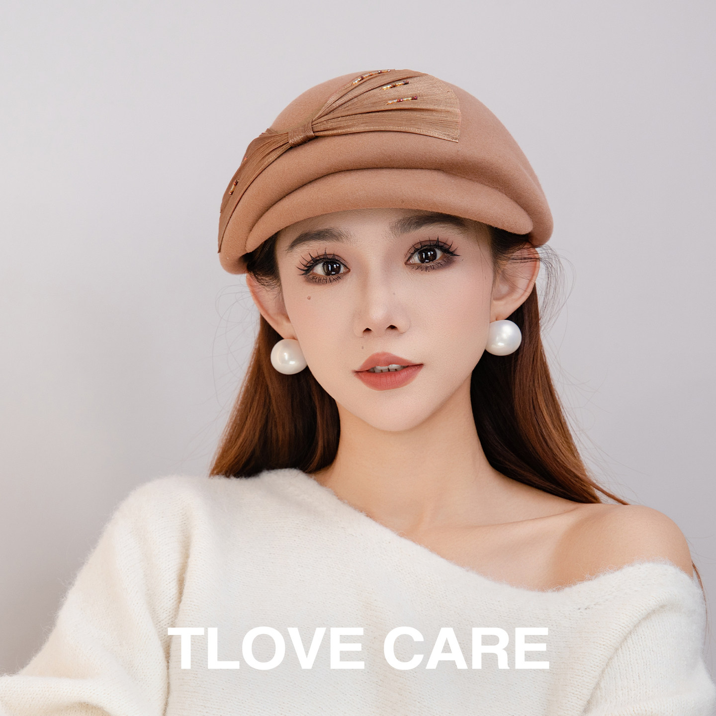 9570立体羊毛贝雷帽女士秋冬季新款优雅真丝麻蝴蝶结赫本风鸭舌帽