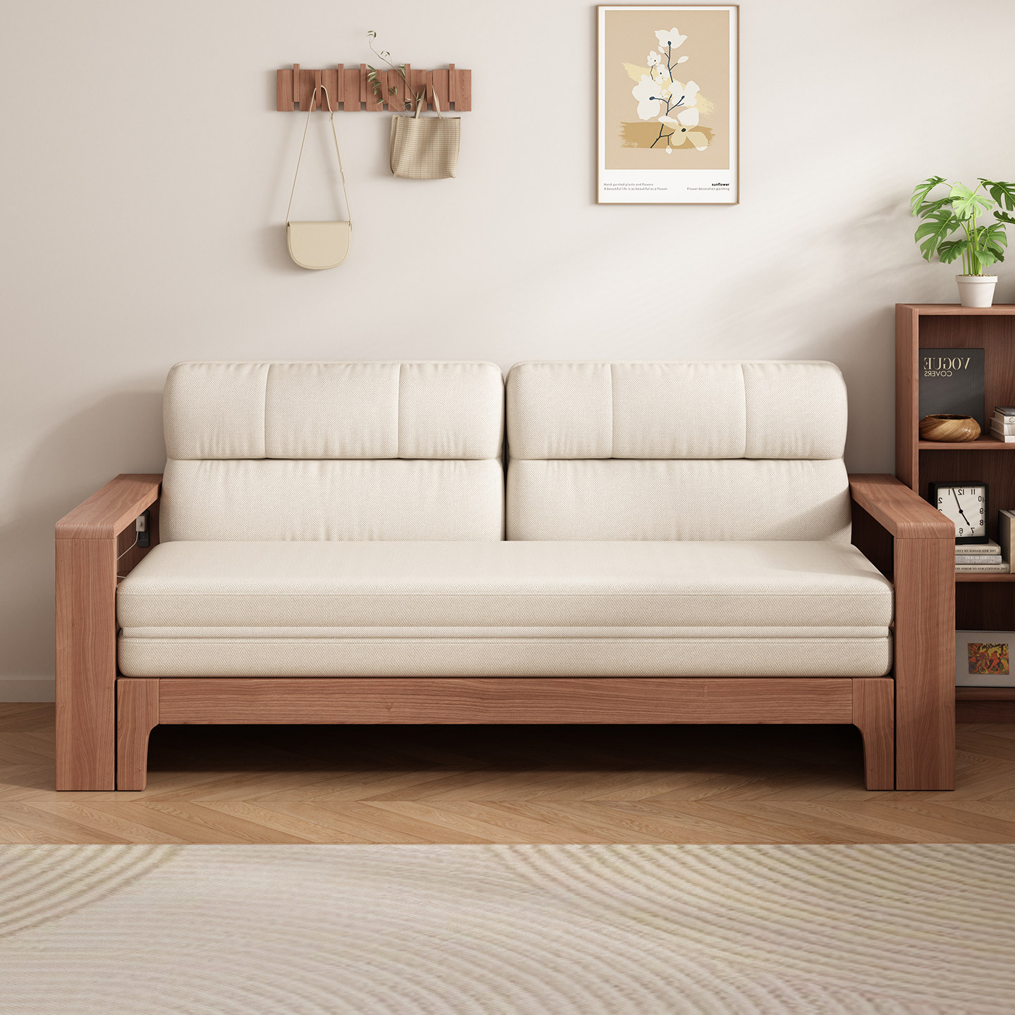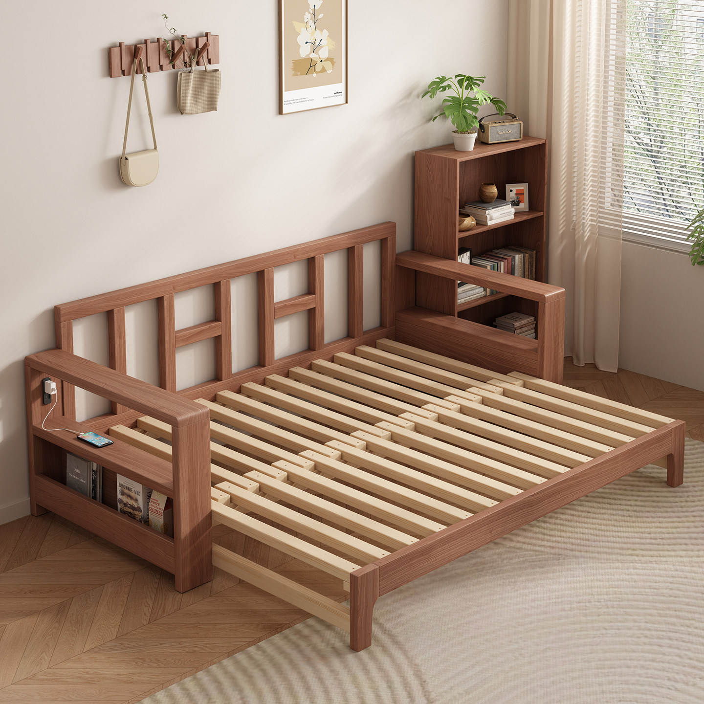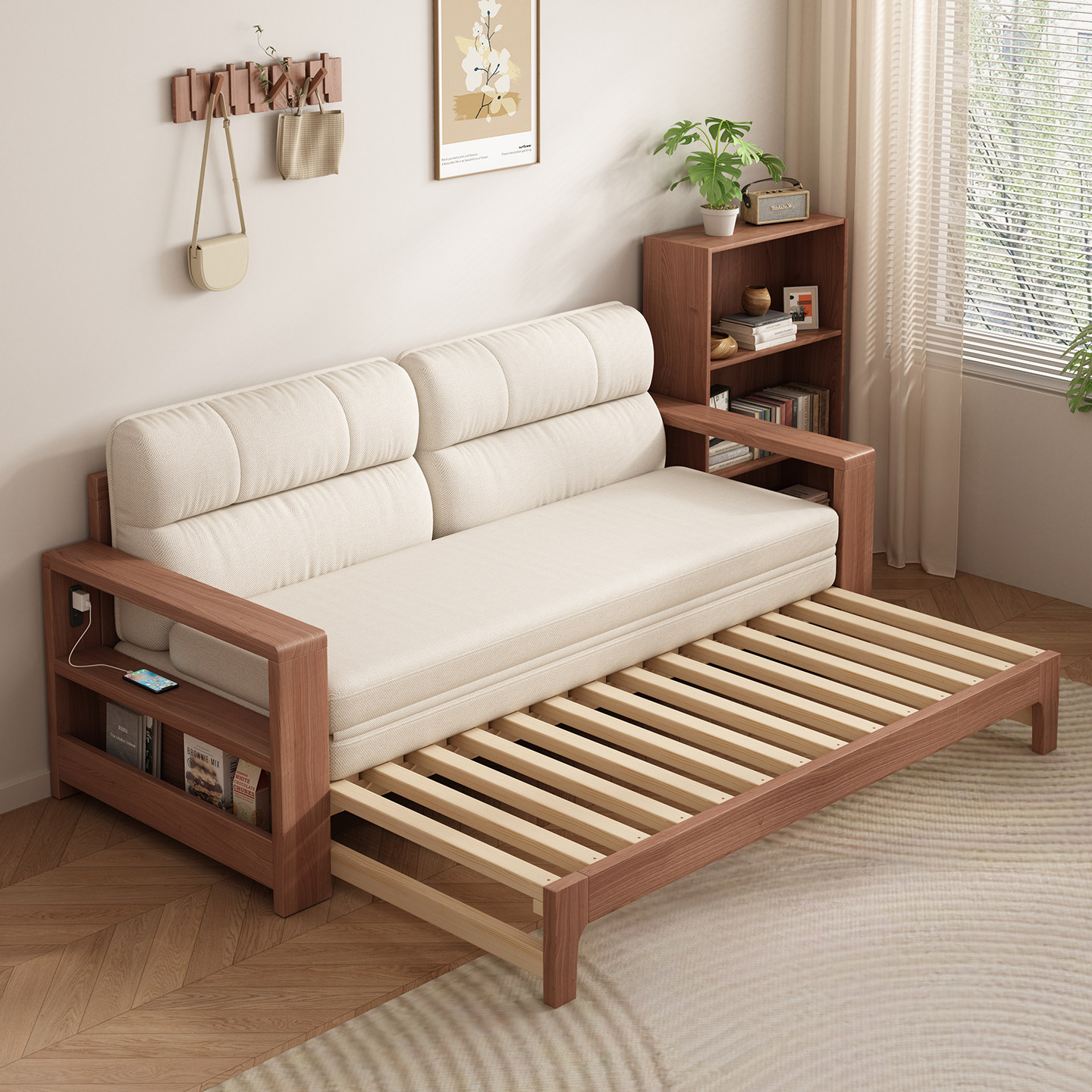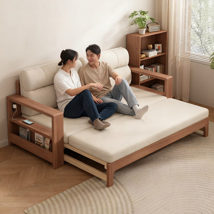 源氏木语实木沙发床折叠两用抽拉床小户型多功能伸缩床客厅双人床