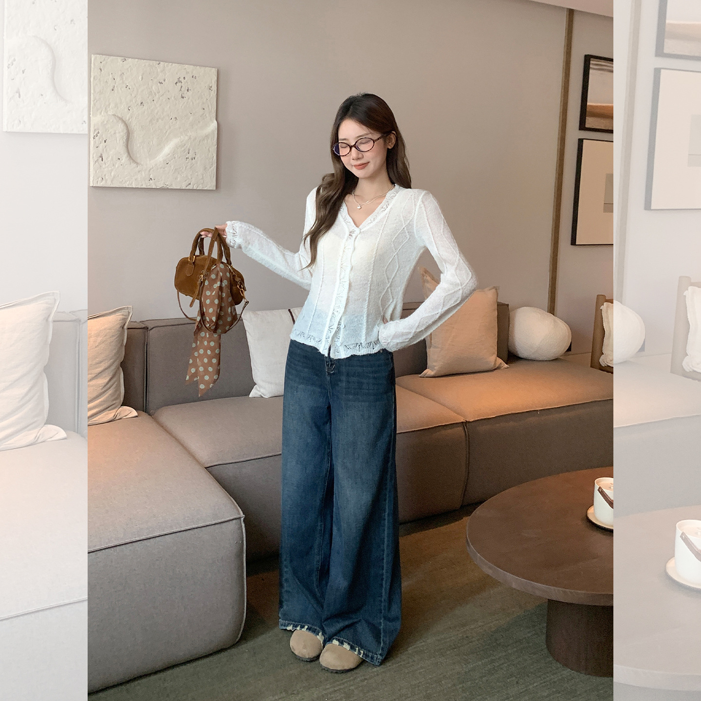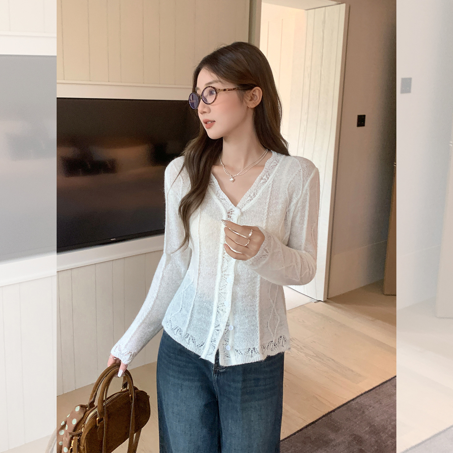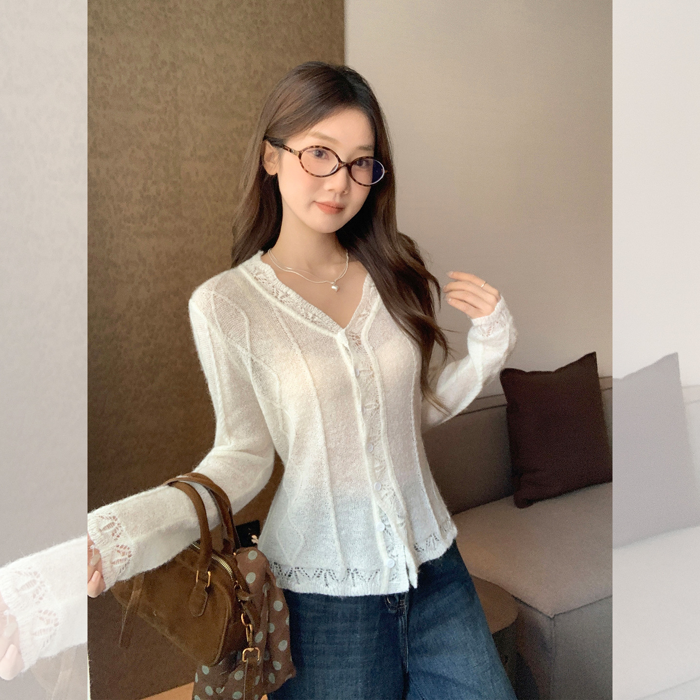 白色蕾丝V领排扣菱格长袖针织衫女装早秋穿搭级感开衫外套上衣