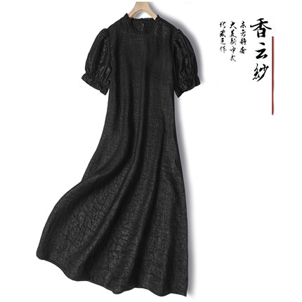 赫本风!香云纱龟裂纹泡泡袖木耳边连衣裙女真丝通勤显瘦裙子新品