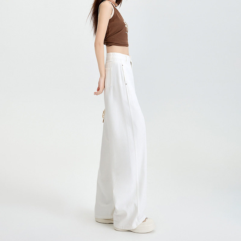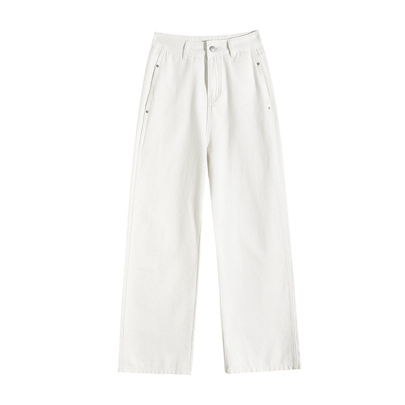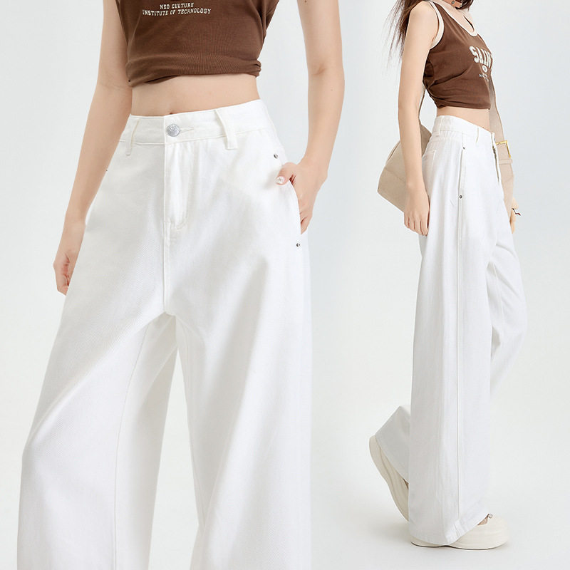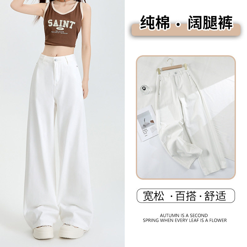 时尚斜插口袋宽松阔腿裤女春季新款高腰显瘦柔软透气直筒牛仔裤子