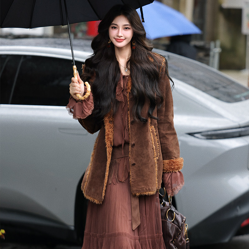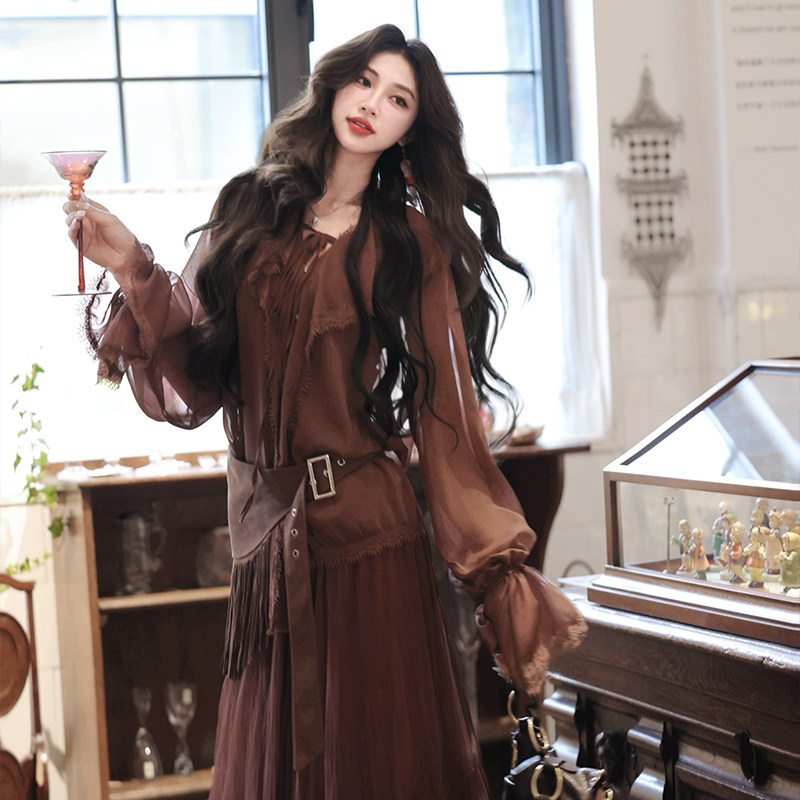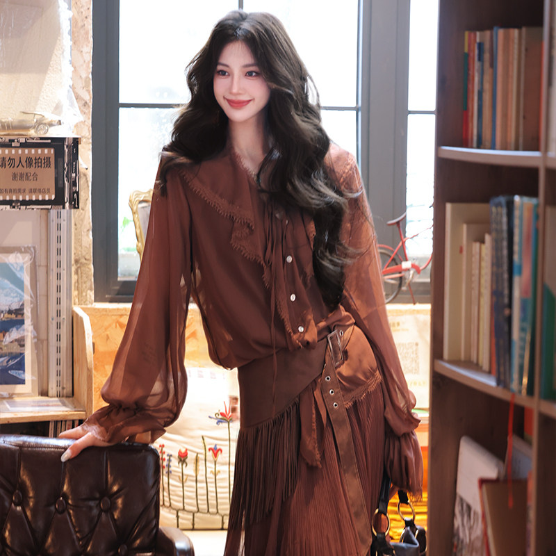 AZure法式复古枫叶棕荷叶蕾丝领衬衫单排扣雪纺衫风琴褶中长半裙