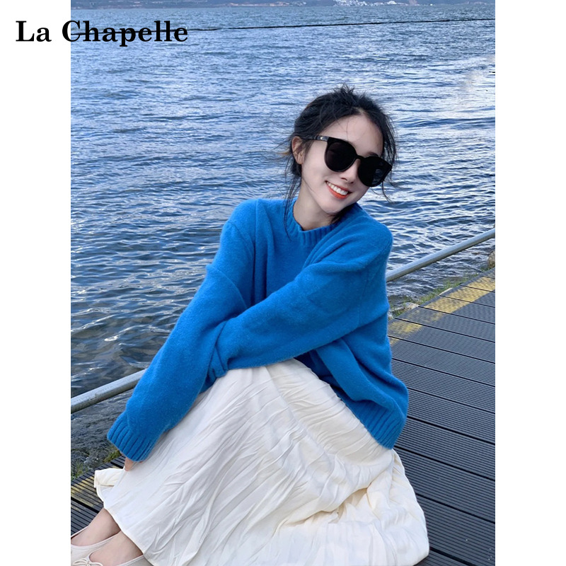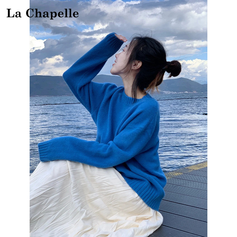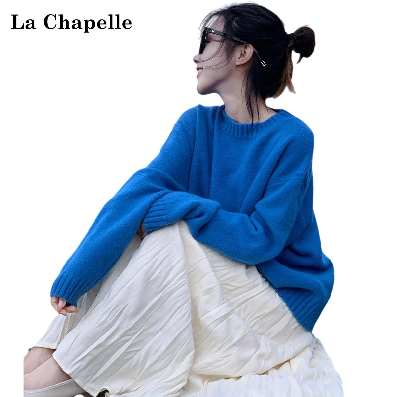 拉夏贝尔克莱因蓝长袖套头毛衣女秋冬新款宽松外穿圆领针织衫上衣