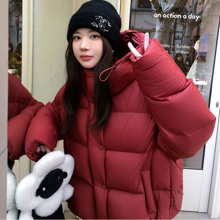 超强御寒羽绒服超柔奶鹅包90白鹅绒外套女红色龟背连帽短款鹅绒服