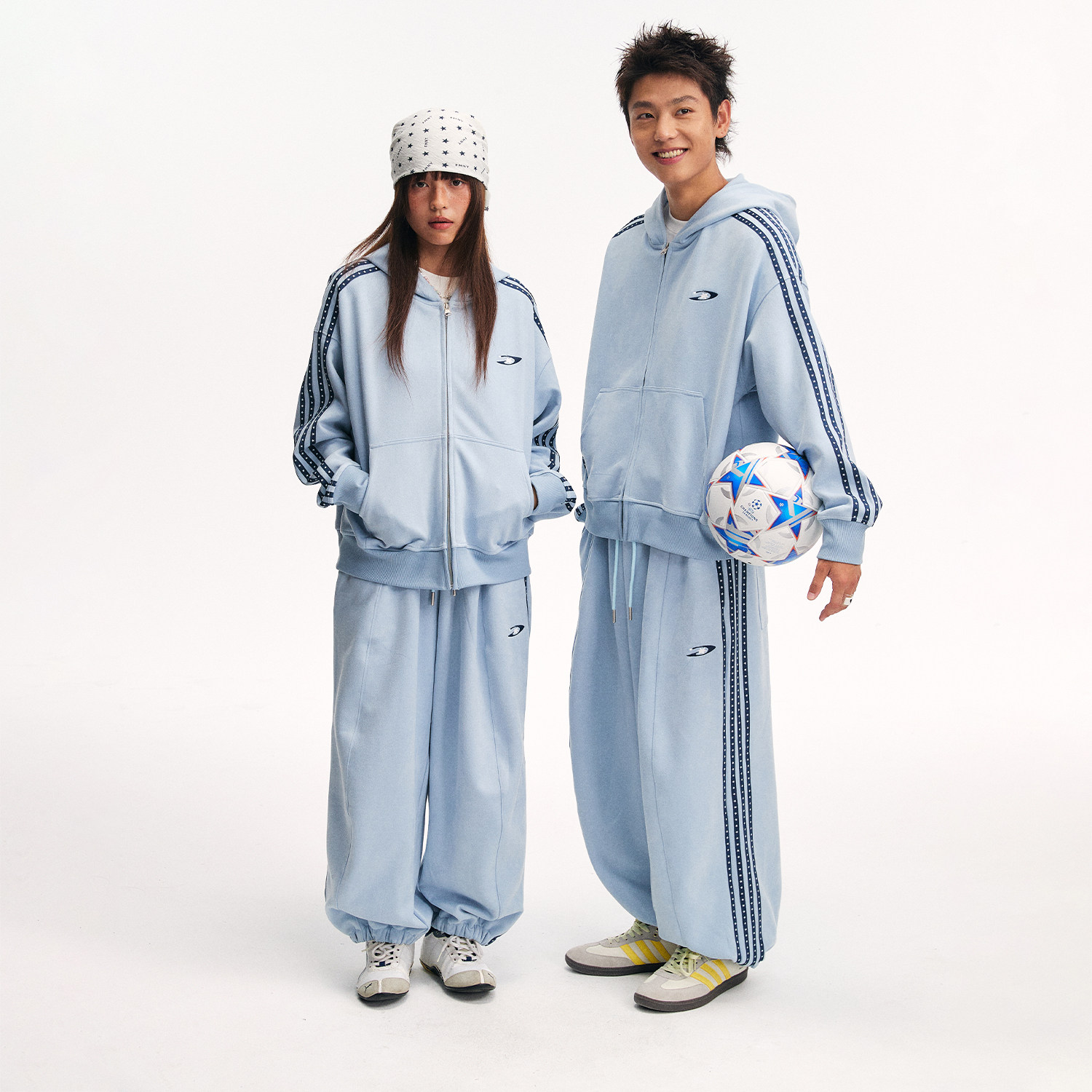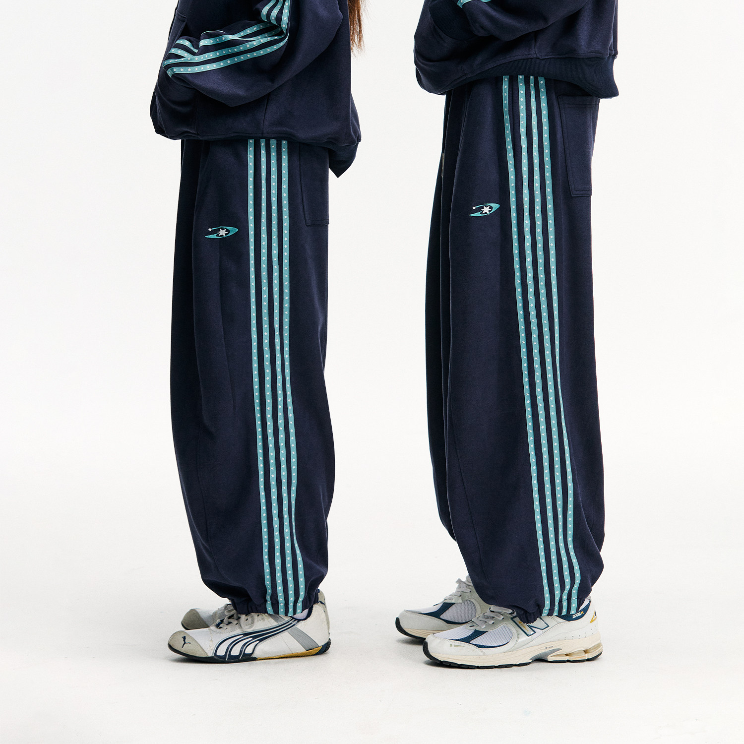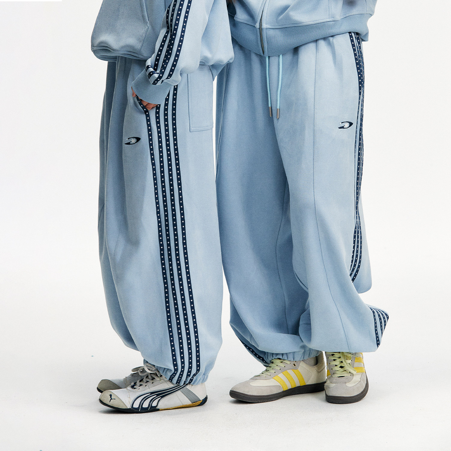 江南先生NewJNXS仿麂皮logo绣花星星织带束脚裤秋季宽松情侣卫裤
