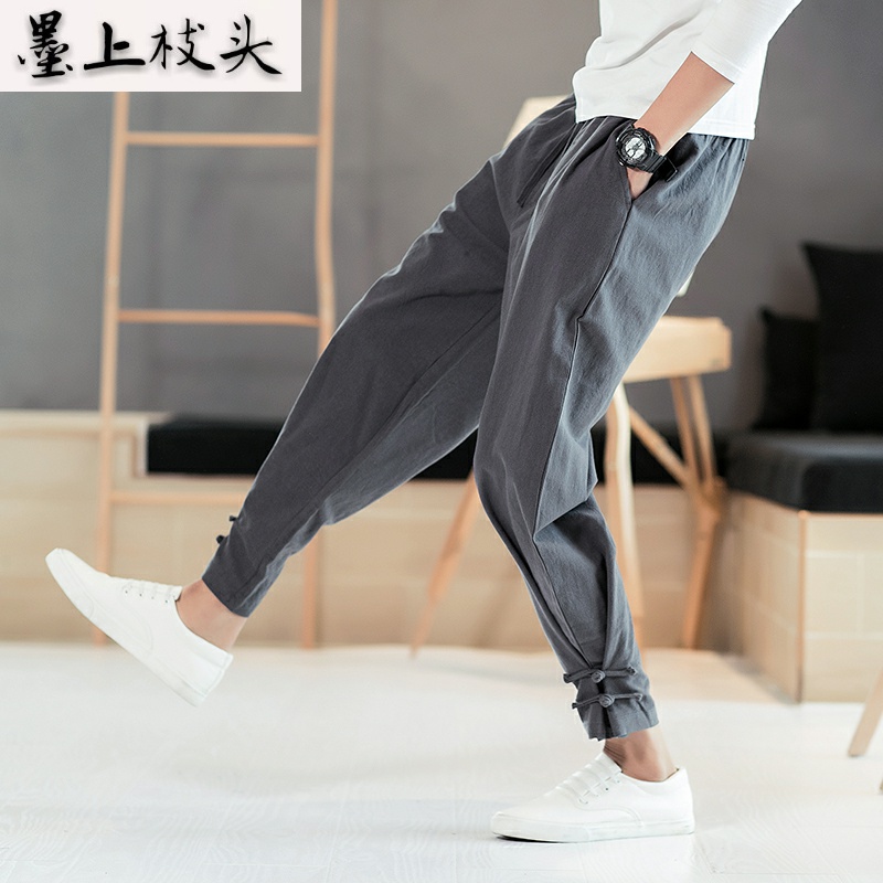 秋冬季唐装哈伦裤子男中国风加绒加厚束脚运动裤宽松棉麻休闲长裤
