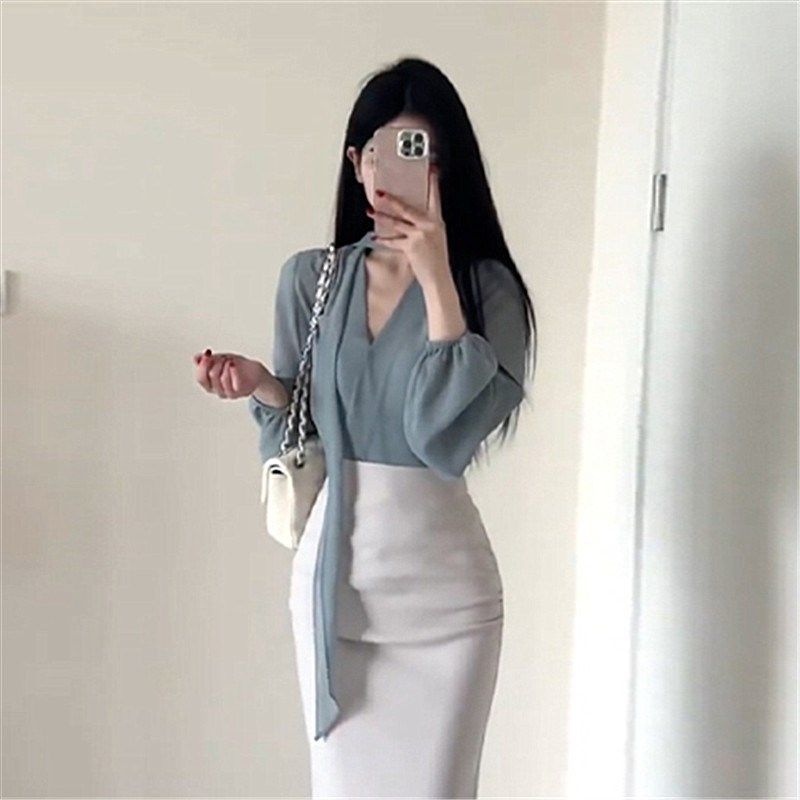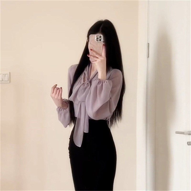 轻熟系长袖宽松雪纺衬衫女2025春秋季飘带V领灯笼袖网红打底衬衣