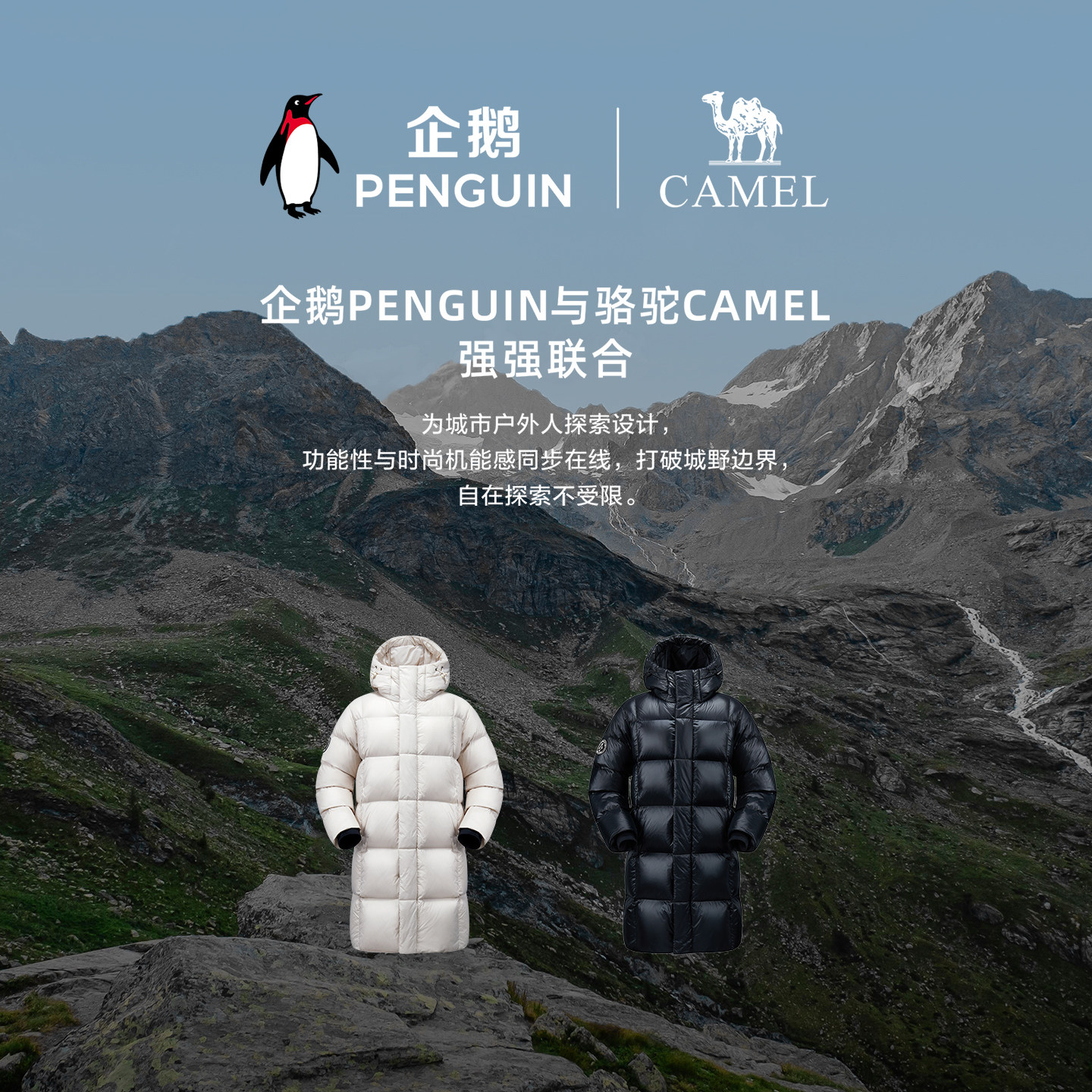 企鹅联名骆驼羽绒服女冬季热能极光新鸭绒中长连帽加厚保暖外套男