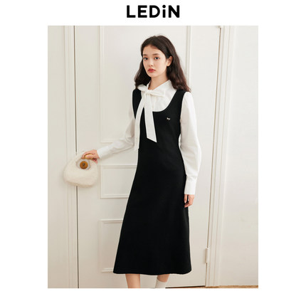 乐町蝴蝶结背心长裙冬季新款基础简约黑色连衣裙收腰大裙摆针织裙