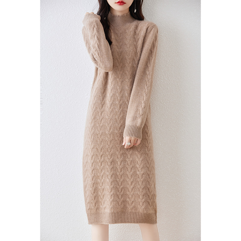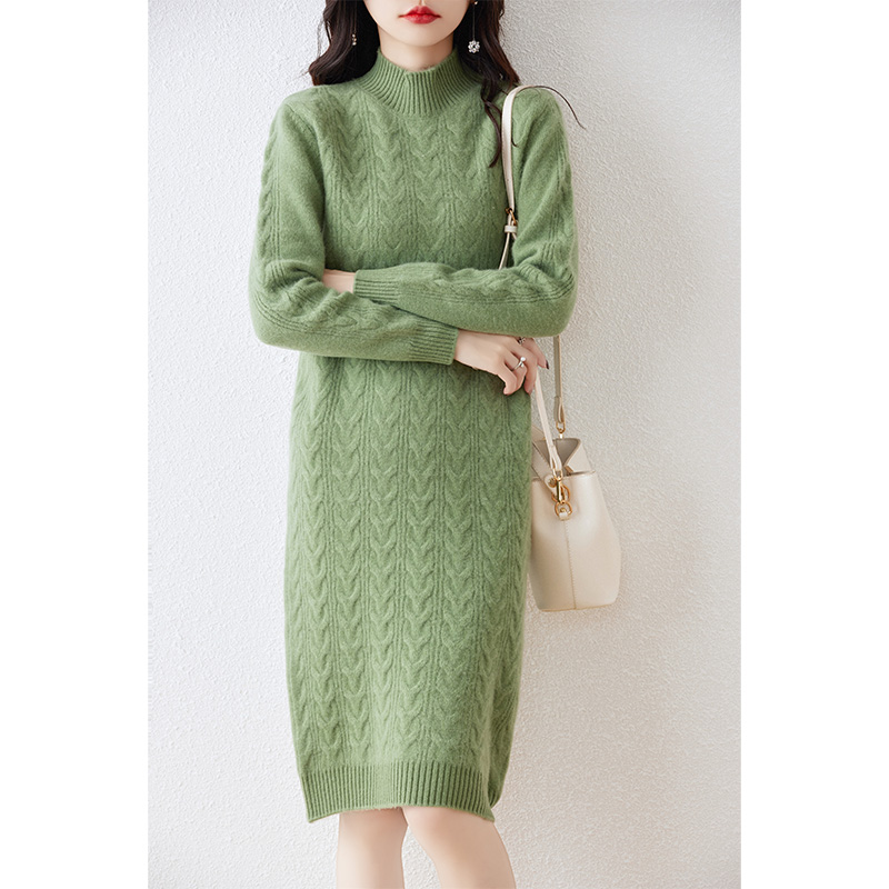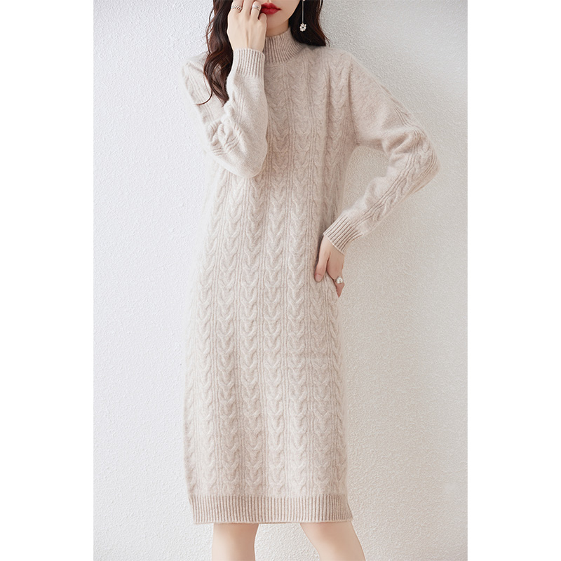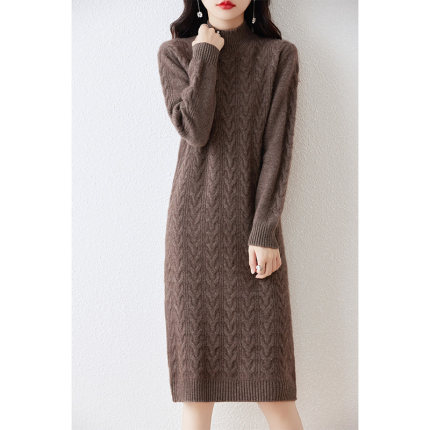 半高领羊毛针织连衣裙女秋冬加厚保暖麻花毛衣裙宽松显瘦打底裙子