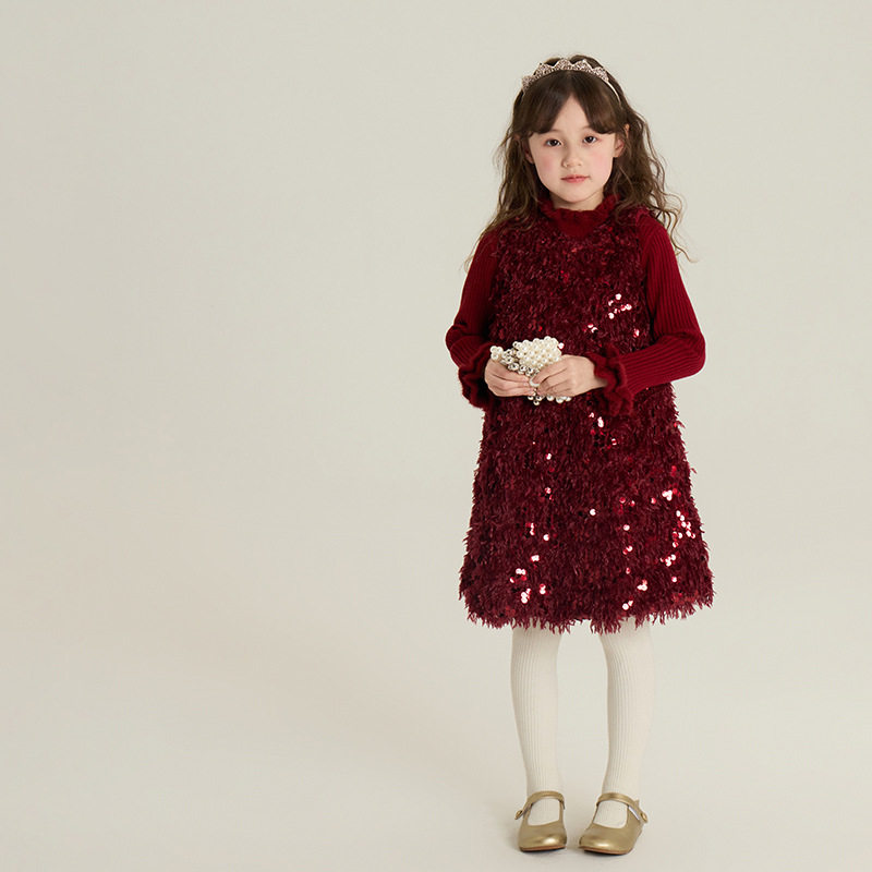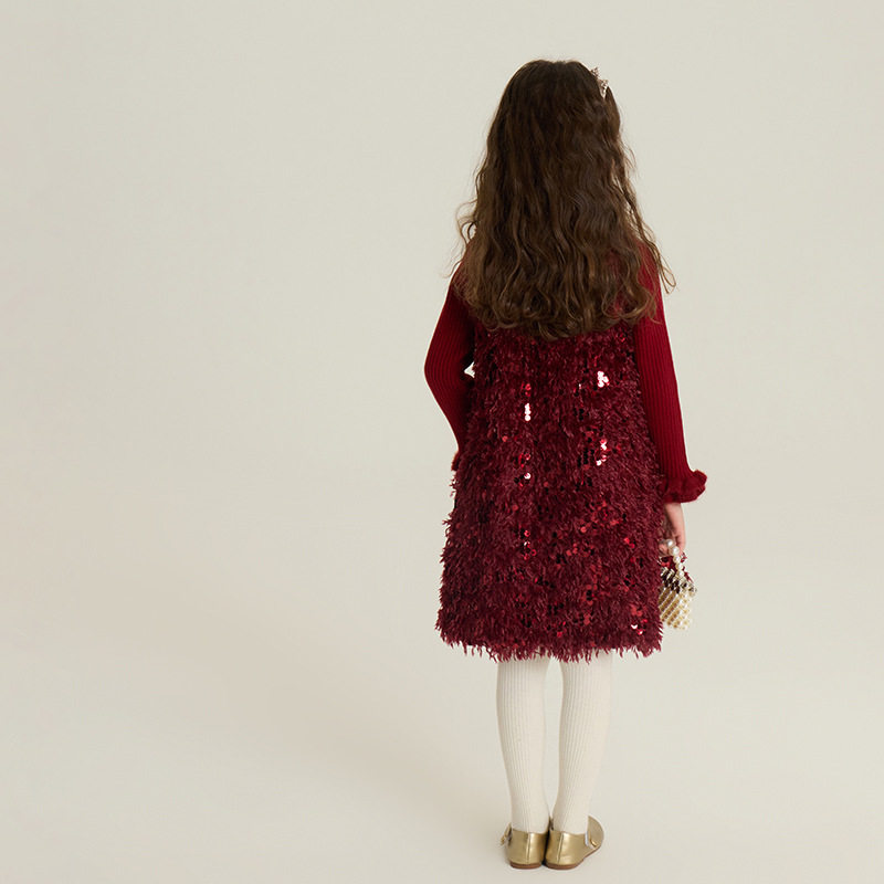 女童洋气酒红色秋冬季新年服连衣裙儿童亮片夹棉礼服中大童背心裙