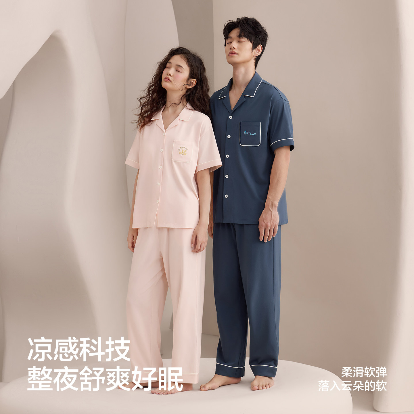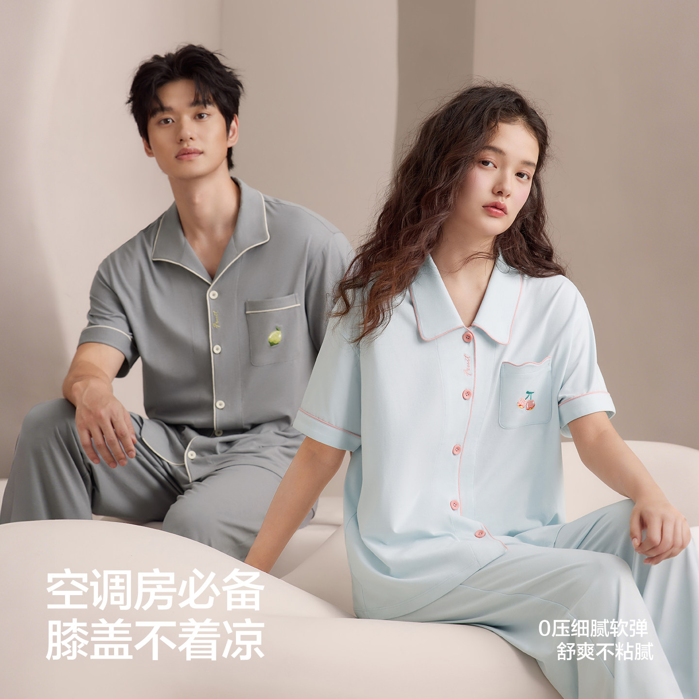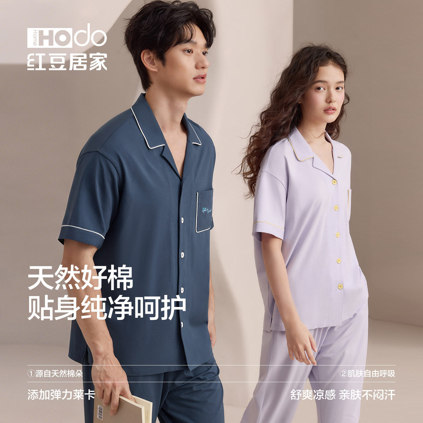 红豆情侣睡衣女夏季薄款短袖长裤凉感棉家居服套装男A类抑菌防螨