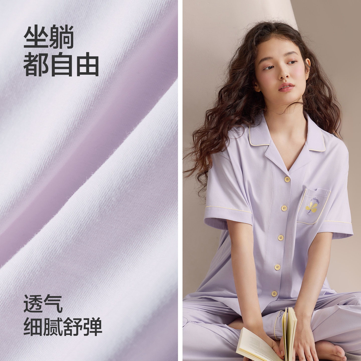 红豆居家凉感棉短袖长裤开衫睡衣