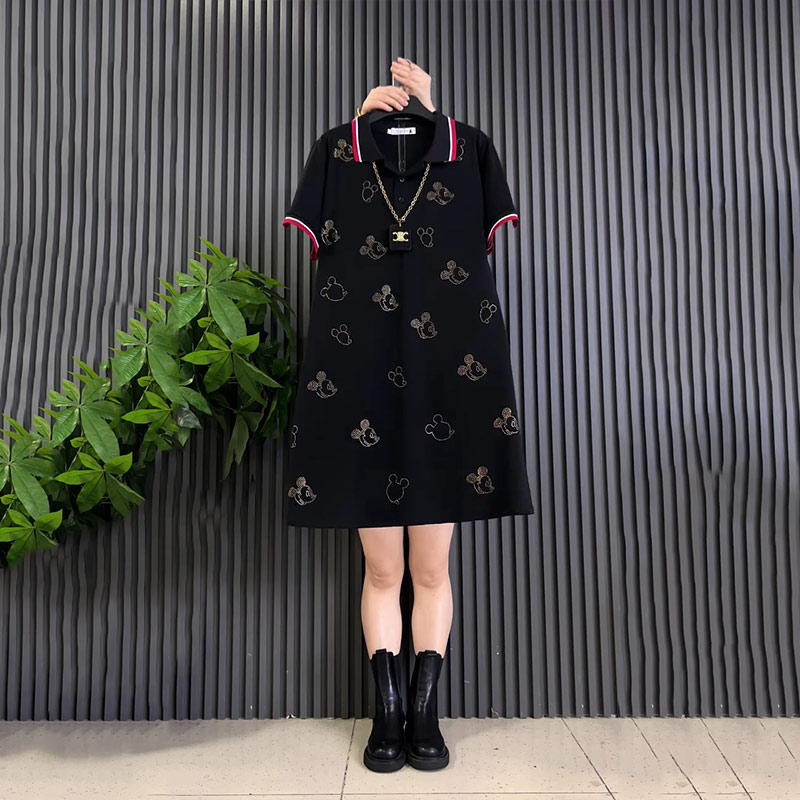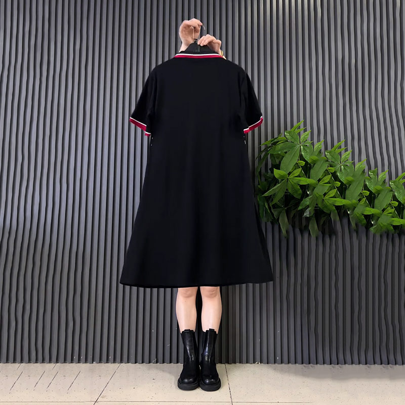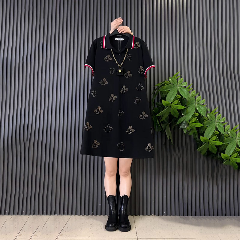 大码女装翻领拼色边卡通图案短袖休闲裙胖妹妹黑色显瘦宽松连衣裙