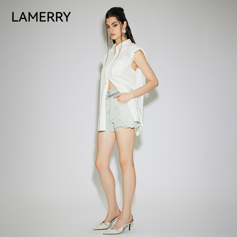 LAMERRY/朗美睿白色无袖重工镂空蝴蝶烫钻衬衫女时尚2025春夏新款