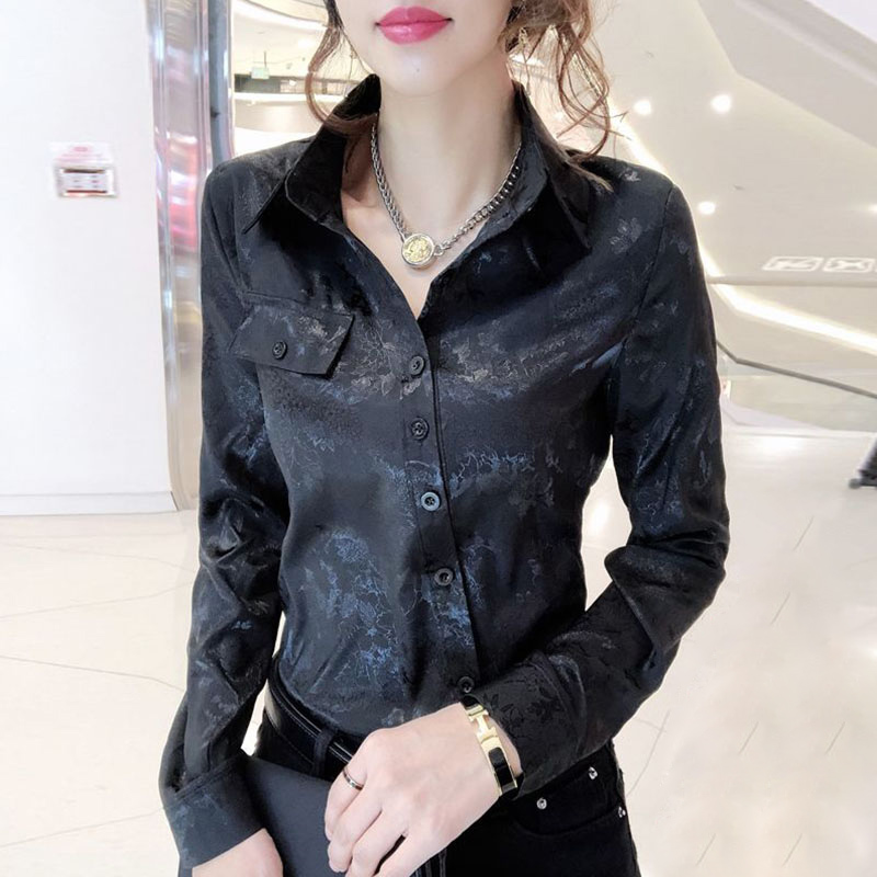 黑色印花衬衫女2024春季新款设计感小众斜襟衬衣修身长袖打底上衣