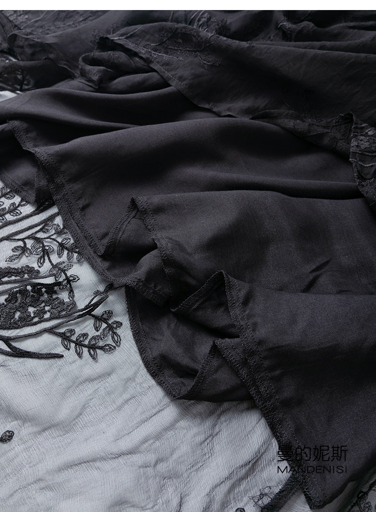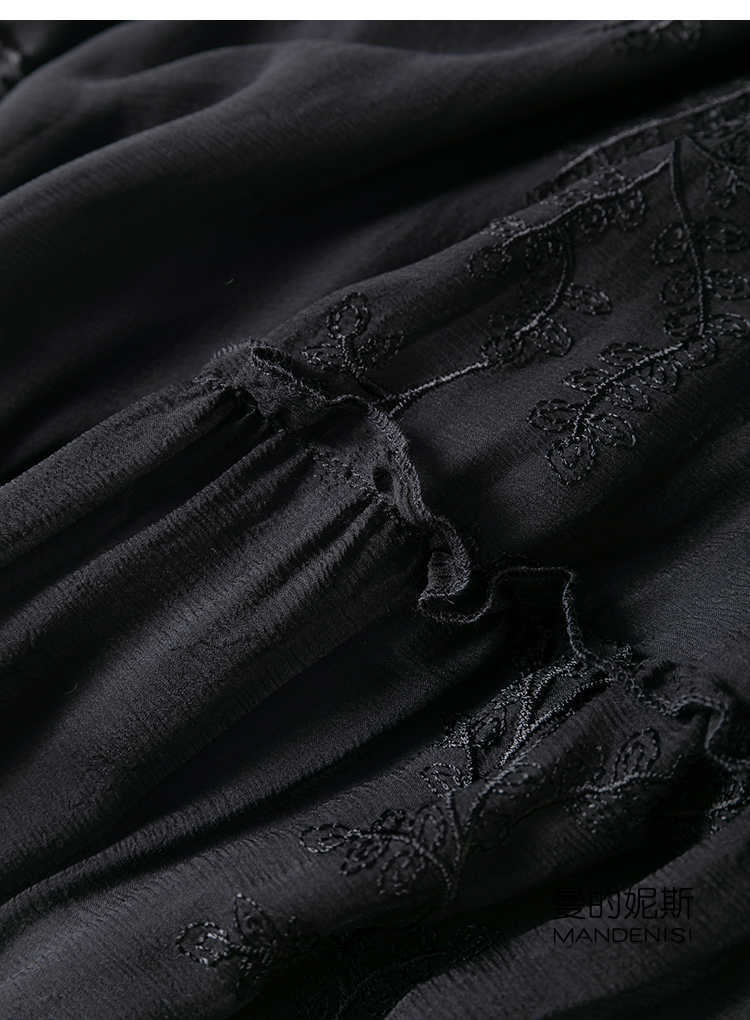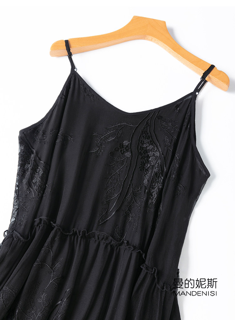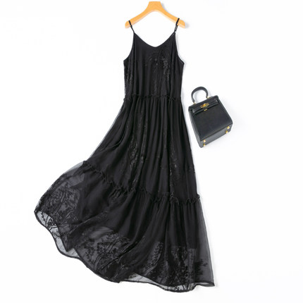 重工刺绣文艺仙气黑色真丝乔其可调节肩带吊带裙海边加长连衣裙新