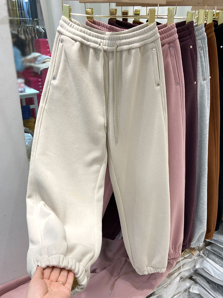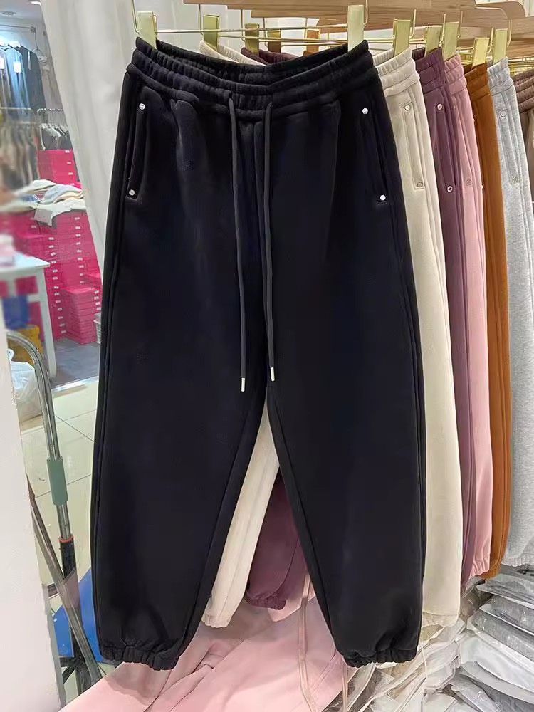 欧货紫色加绒卫裤女小个子冬季加厚九分宽松哈伦裤休闲束脚运动裤