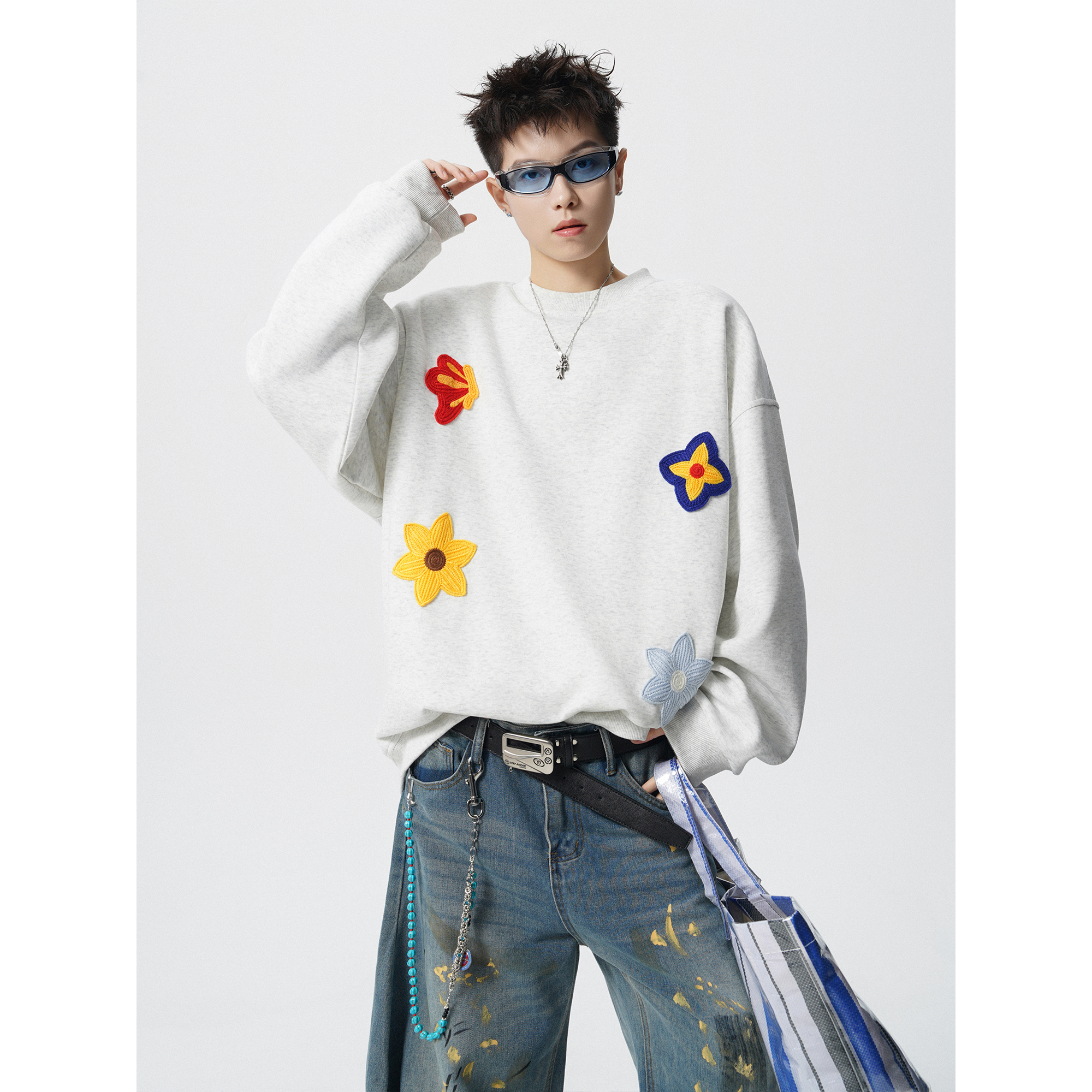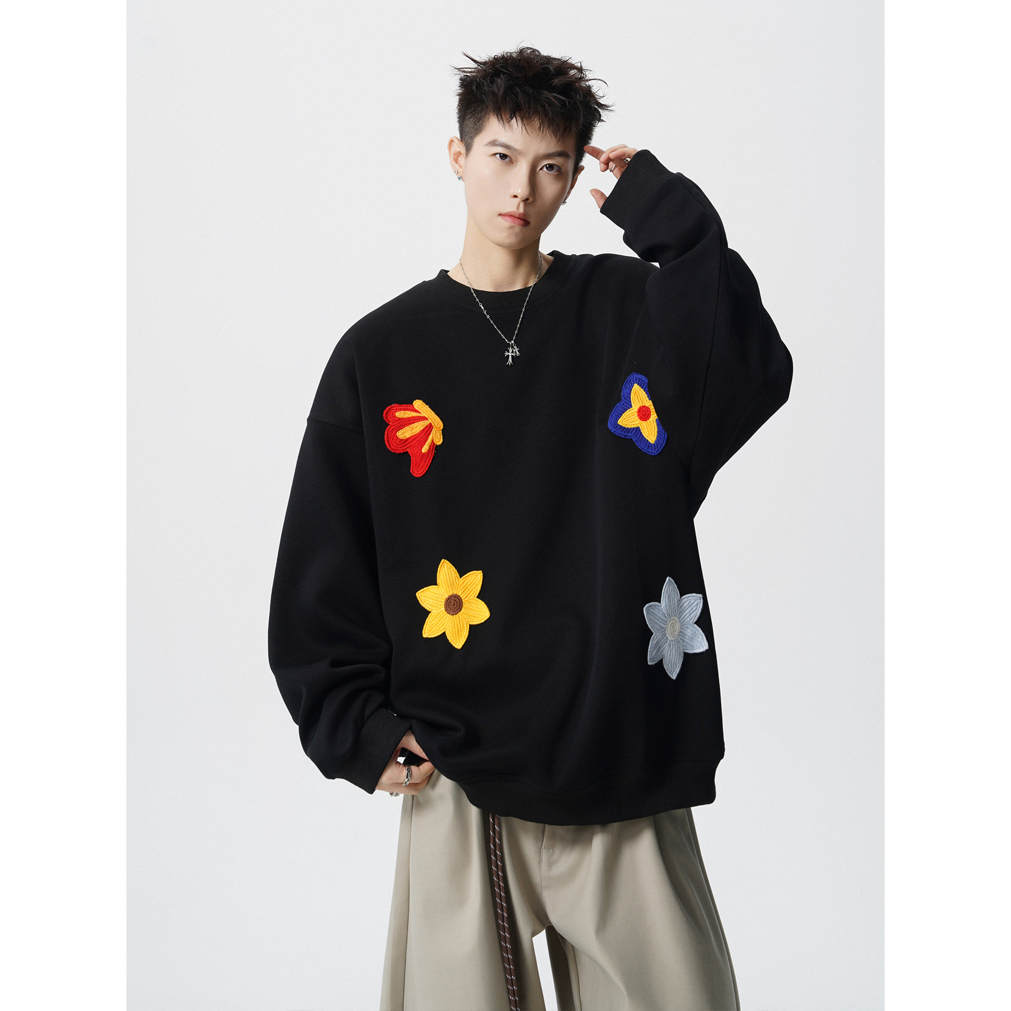 美式花卉刺绣圆领卫衣男秋季潮牌