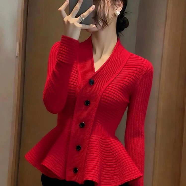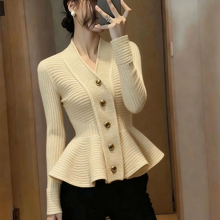 商场同款新款2025秋冬季气质V领荷叶边羊毛针织开衫收腰显瘦上衣