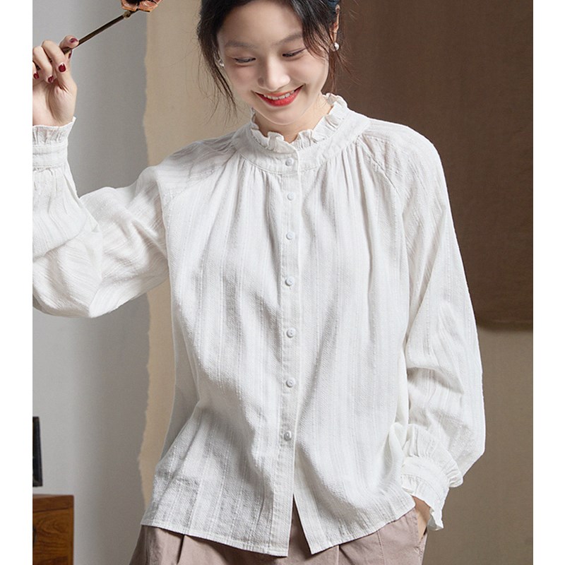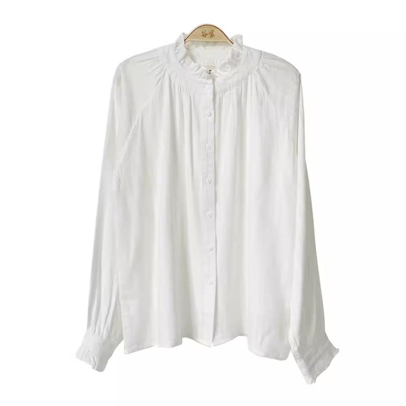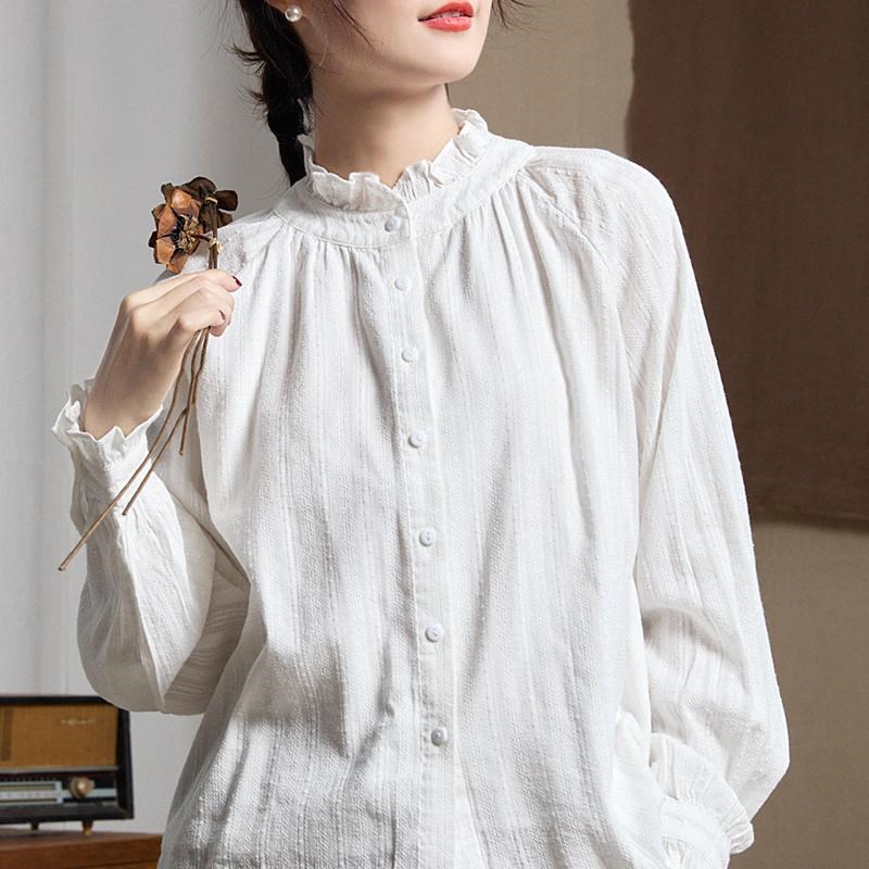 谷家 法式花边领全棉提花长袖衬衫 2025春显瘦叠穿打底白色上衣女