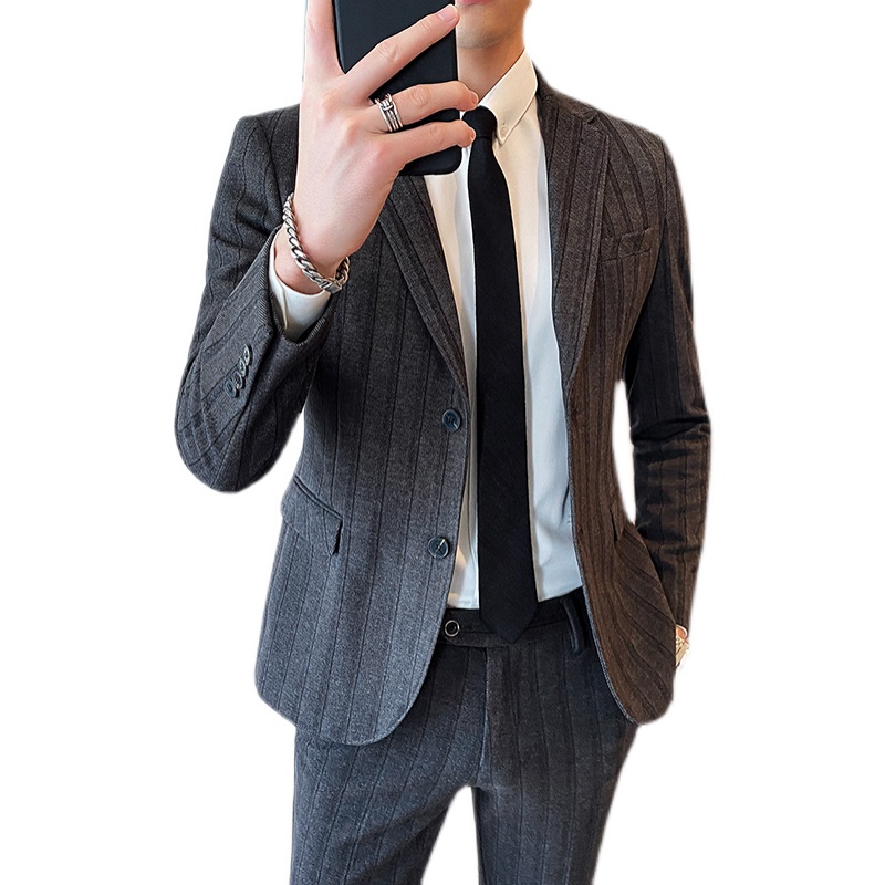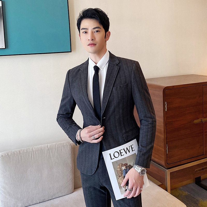 秋冬英伦风毛呢加厚西装两件套修身免烫商务休闲条纹西服套装男帅
