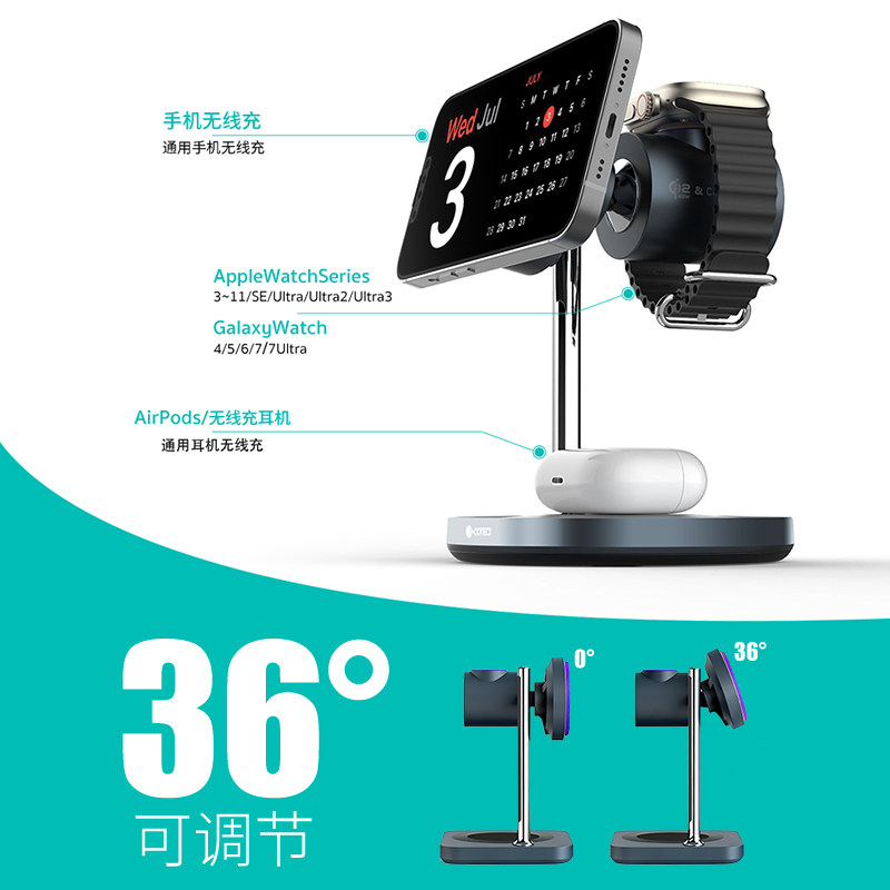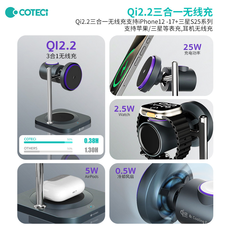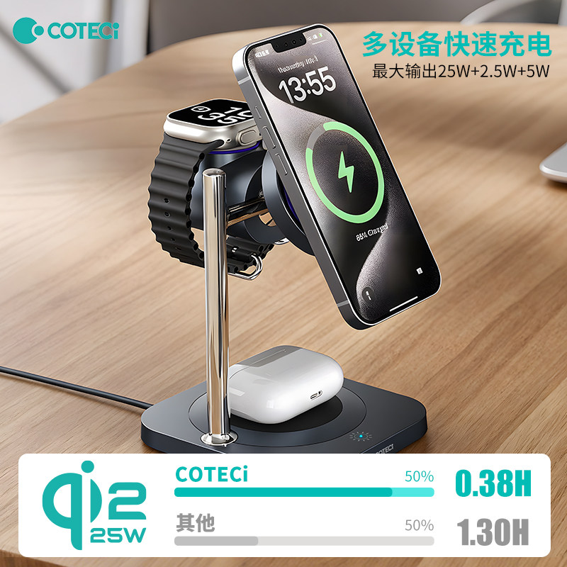COTECi三合一25W充电器 Qi2.2认证 适用苹果华为三星无线磁吸充电