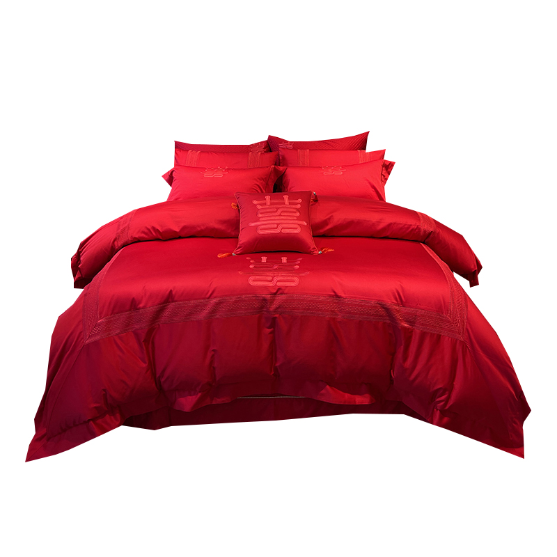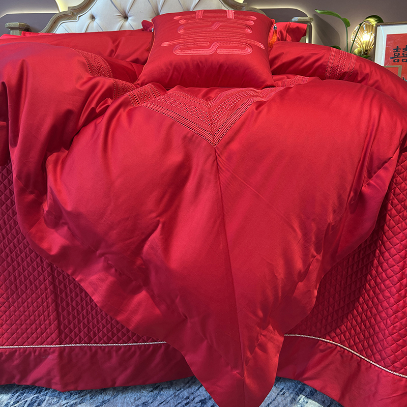 高端140支长绒棉四件套全棉大红色婚庆陪嫁结婚刺绣被套新婚床品
