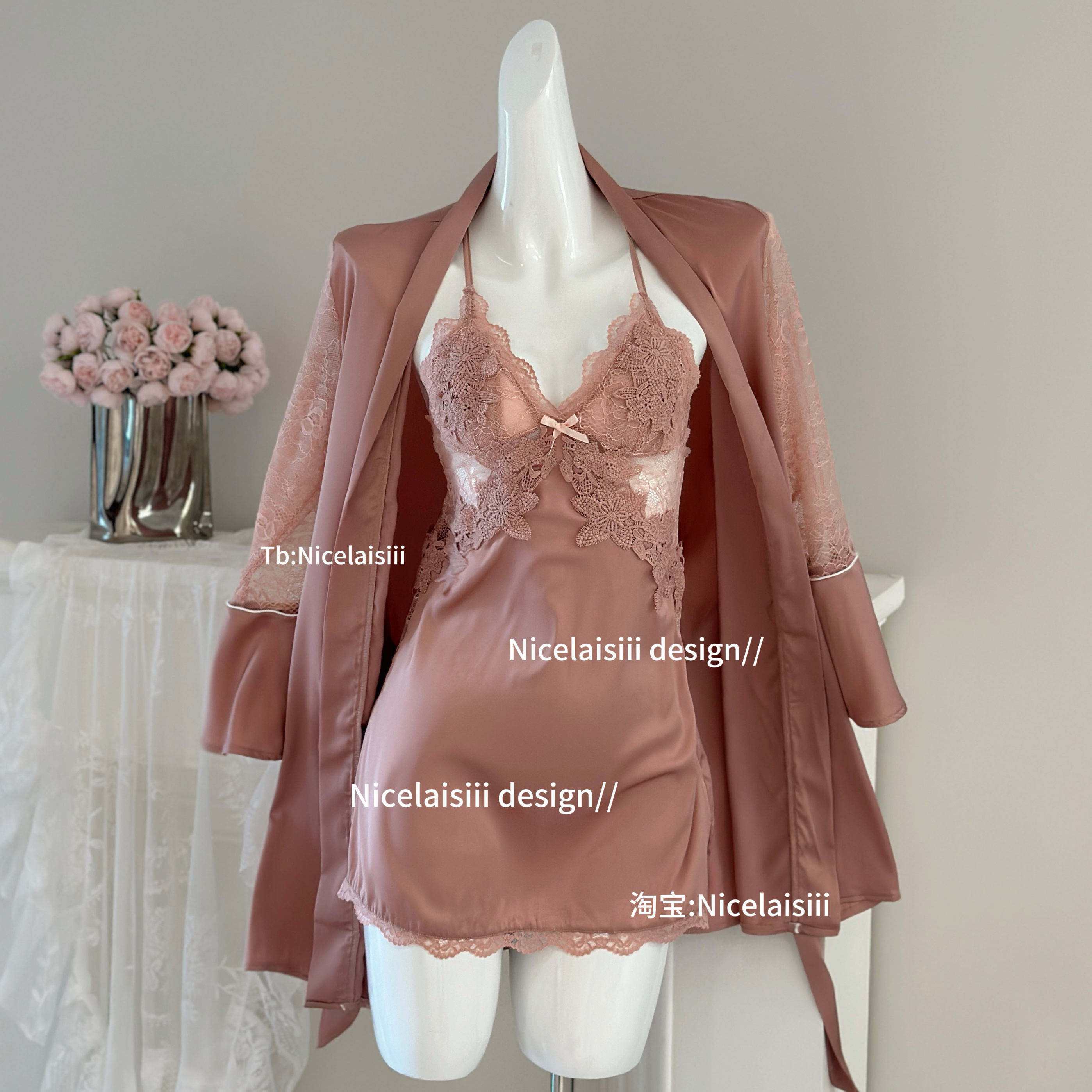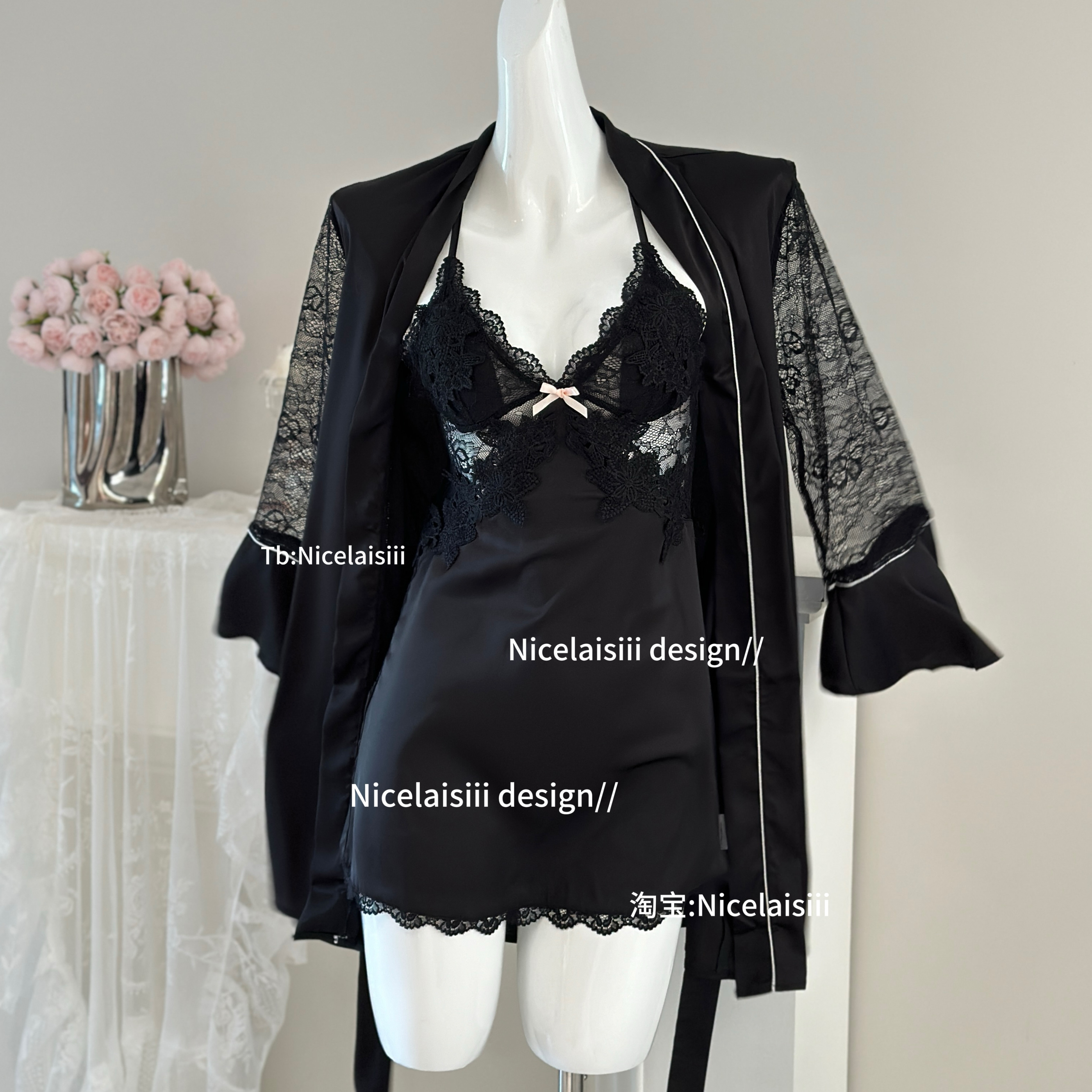 Nicelaisiii伊甸园 性感睡衣女蕾丝吊带睡裙v领带胸垫法式家居服