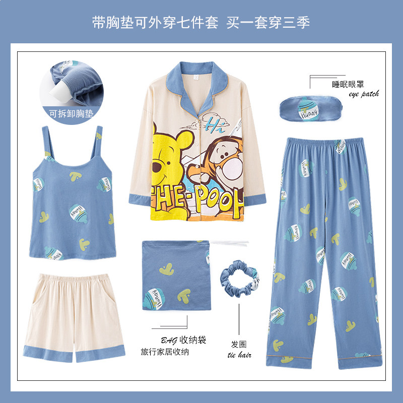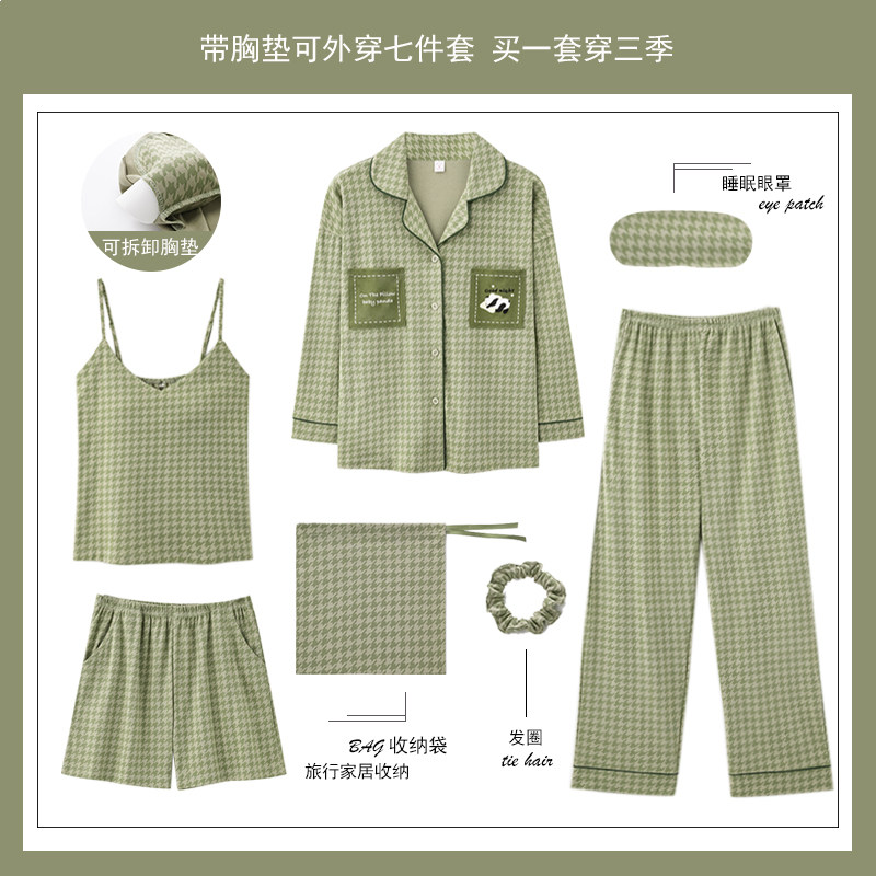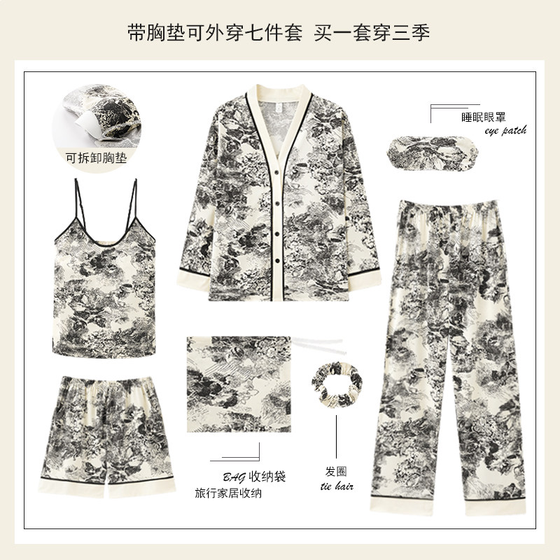 春夏天七件套睡衣女春秋季2026新款吊带性感带胸垫长袖家居服纯棉