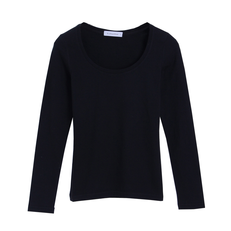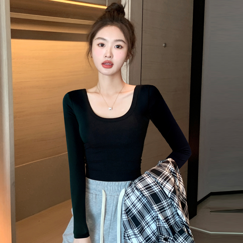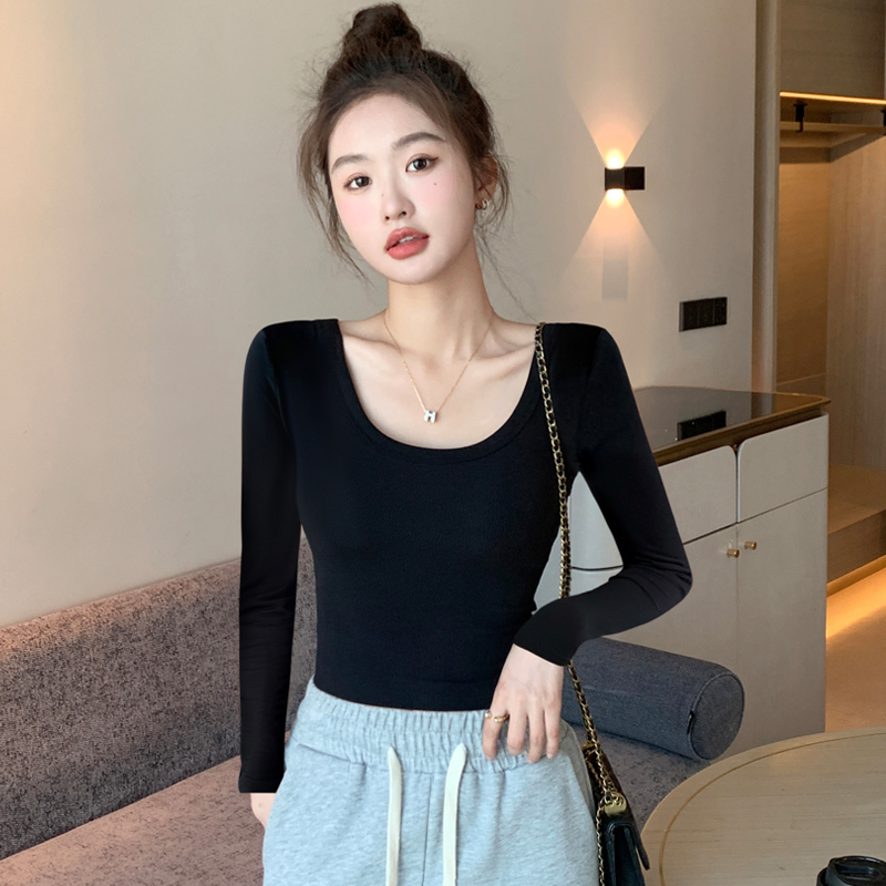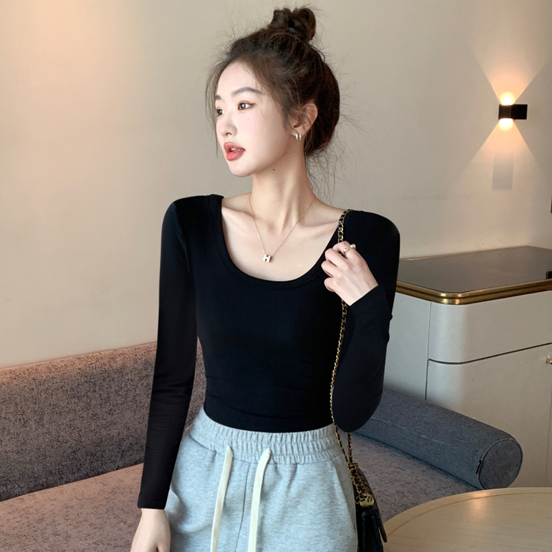 纯棉黑色U领打底衫女内搭2023春秋冬低领长袖t恤洋气圆领紧身上衣