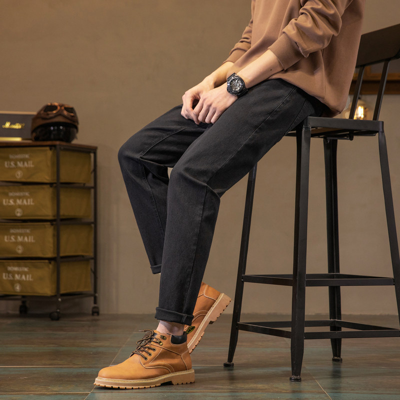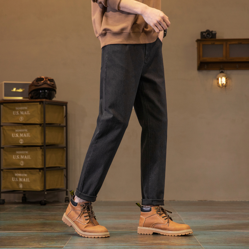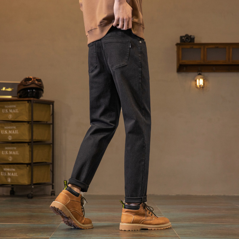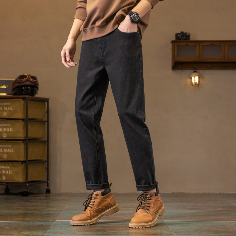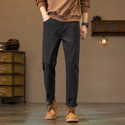 唐狮春秋新款弹力牛仔裤男士修身直筒裤潮流加绒黑色裤子男冬