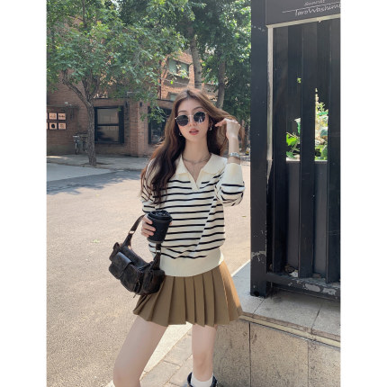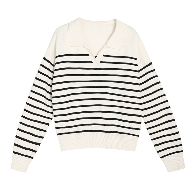 MULVAN polo翻领条纹毛衣女秋冬新款韩版宽松v针织衫套头上衣