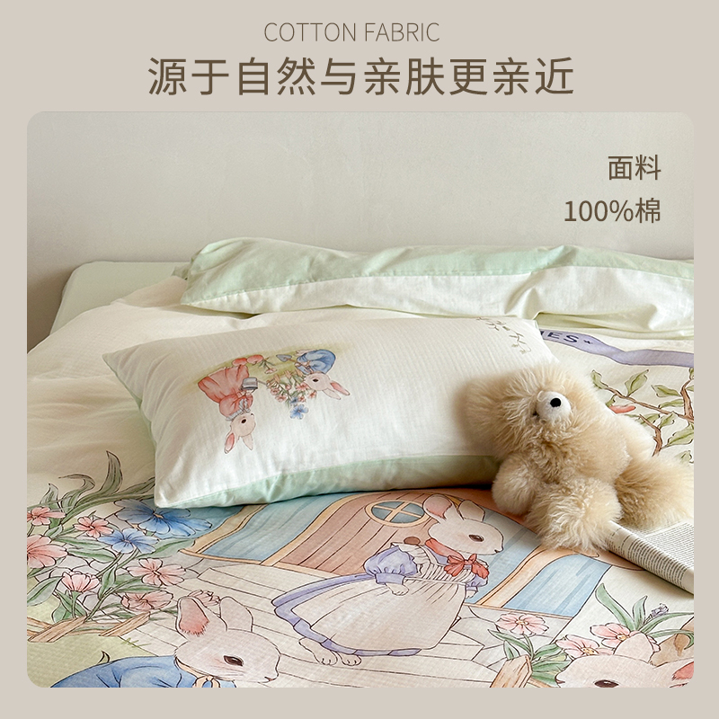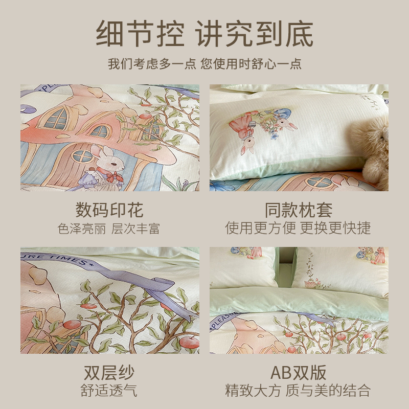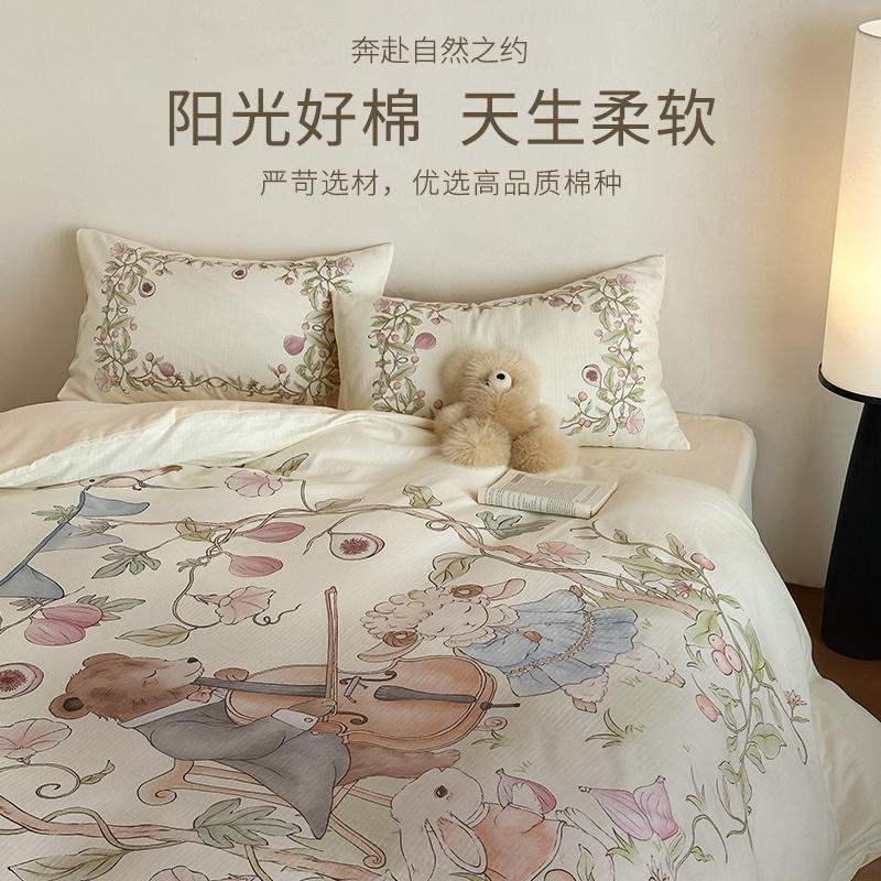 芸裕7A抗菌工艺儿童套件床品 森林纱绘全棉圆角双层纱印花四件套
