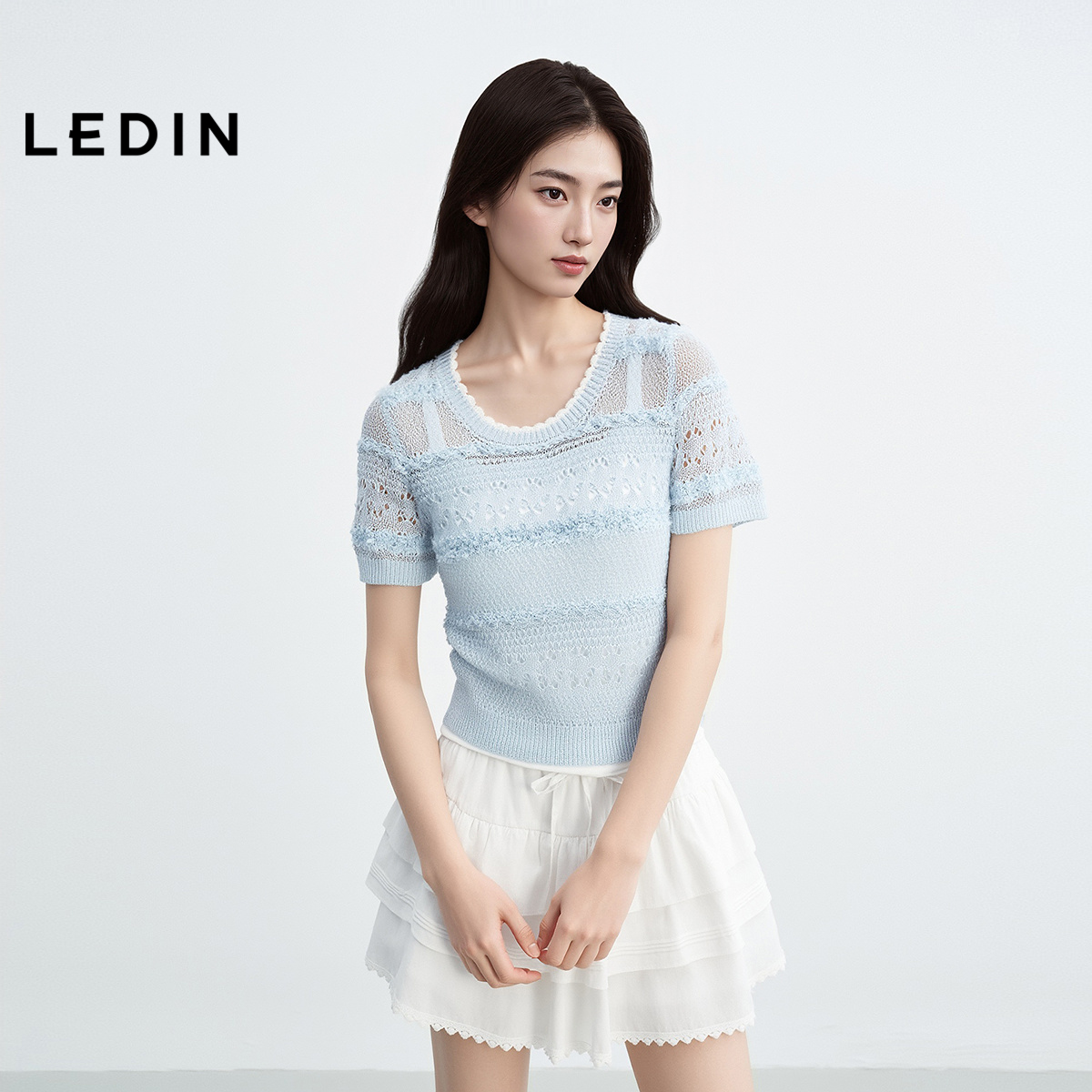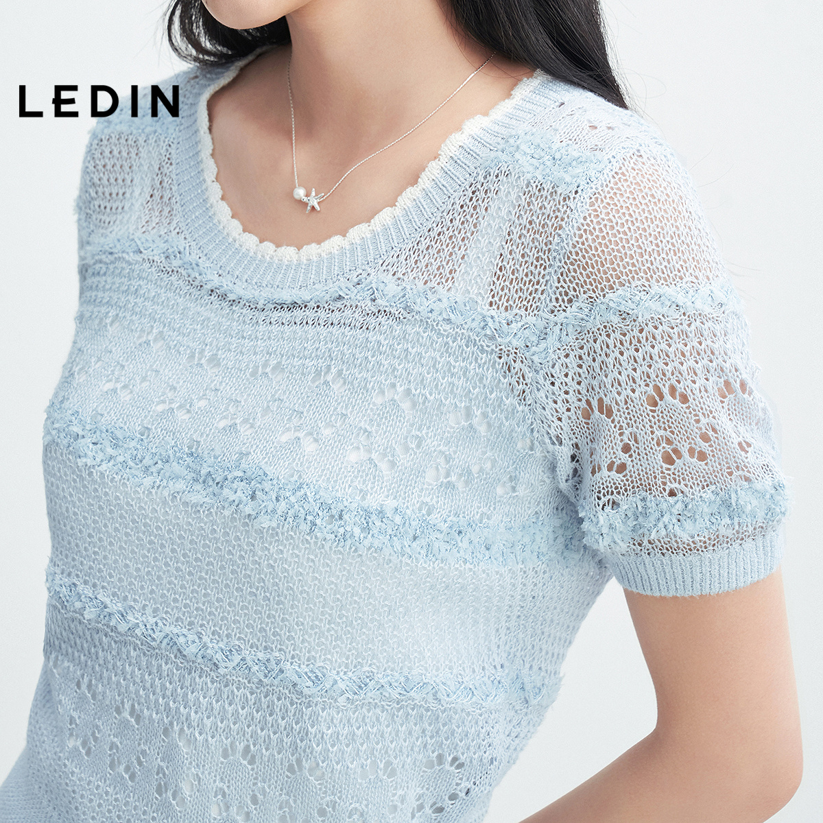乐町韩系温柔风针织短袖夏撞色领口短款上衣竹节麻线套衫T恤