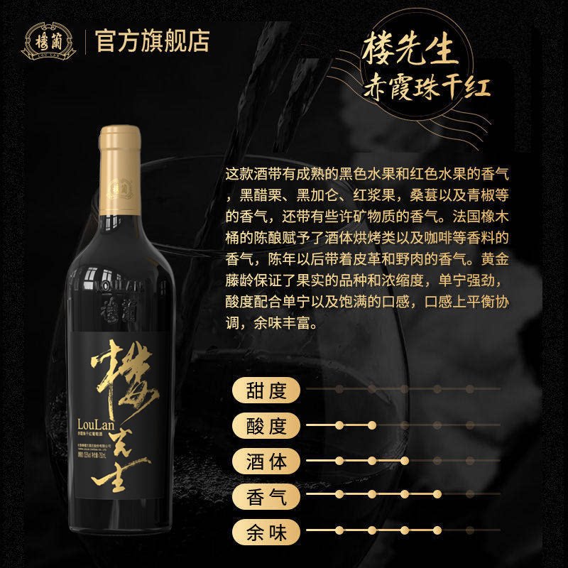 国产新疆楼兰酒庄正品红酒楼先生赤霞珠干红静态葡萄酒整箱6瓶装