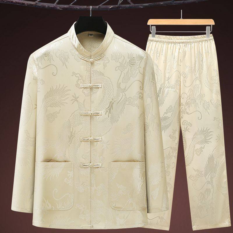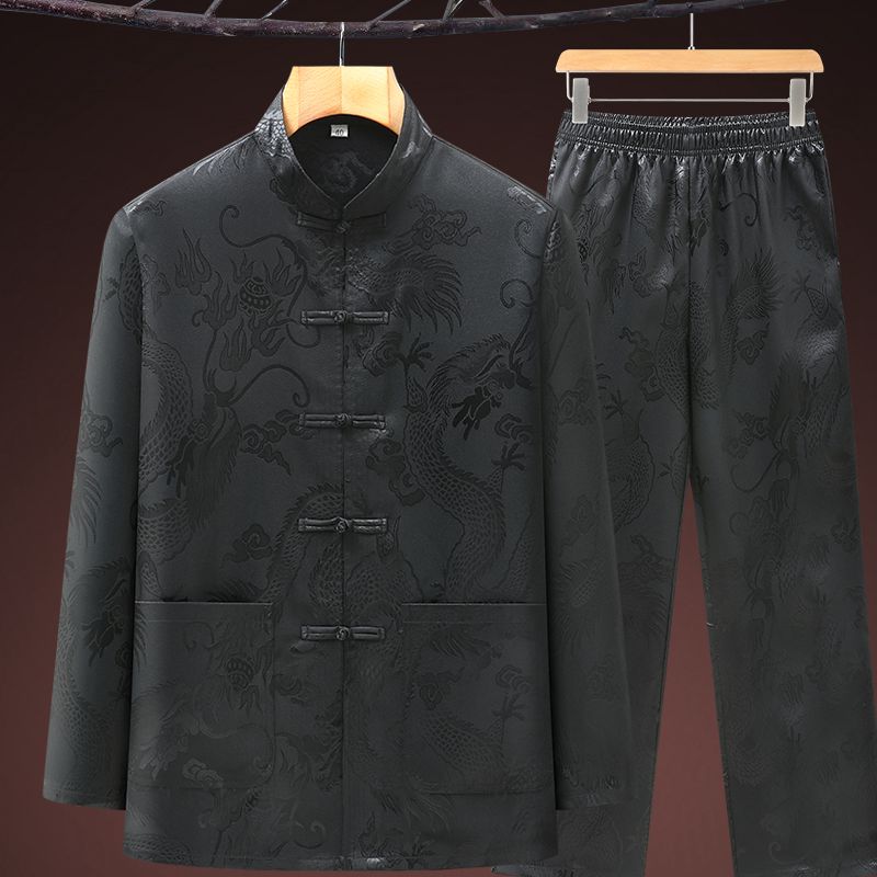 新中式唐装男中老年人春夏季冰丝长袖套装盘龙纹爷爷装汉服太极服