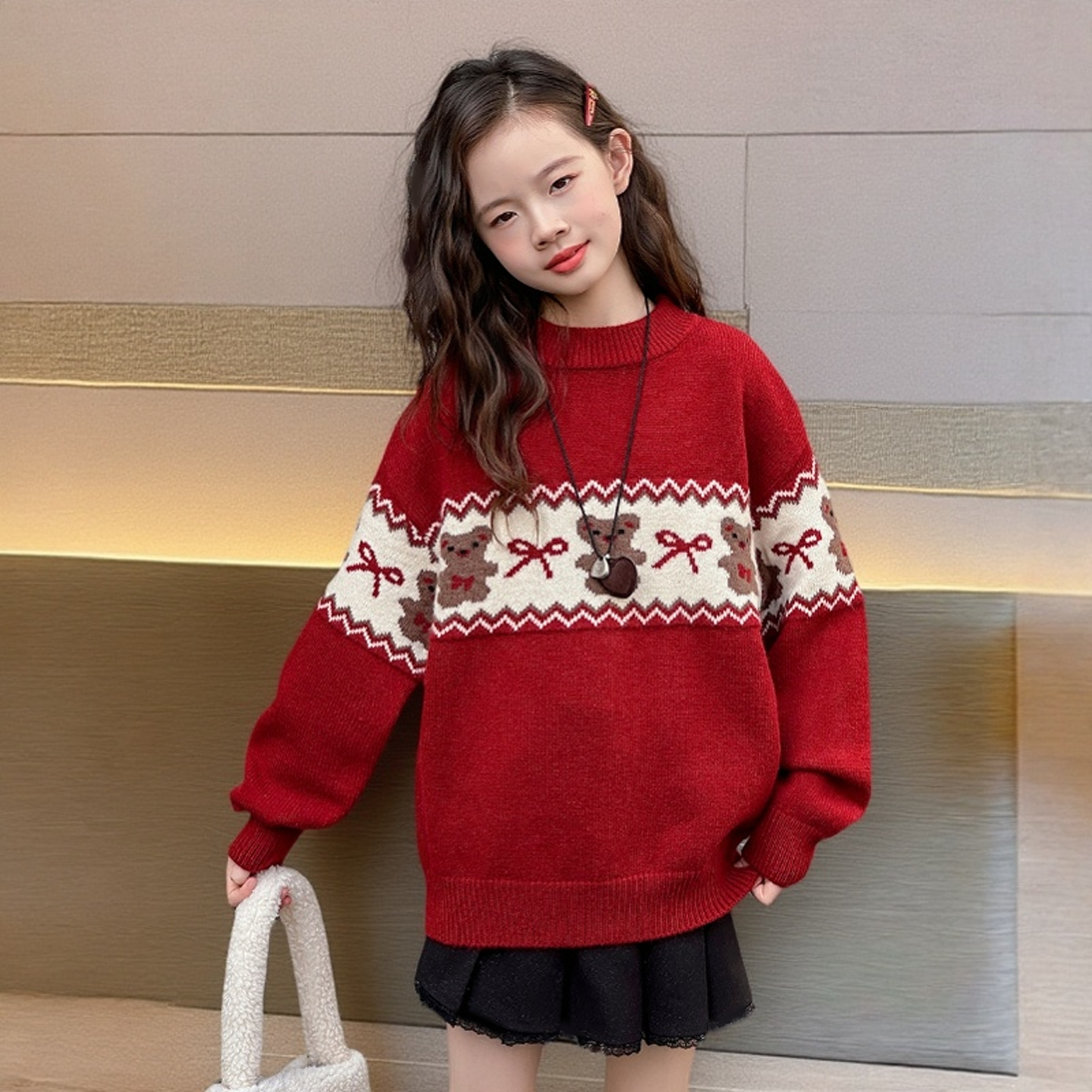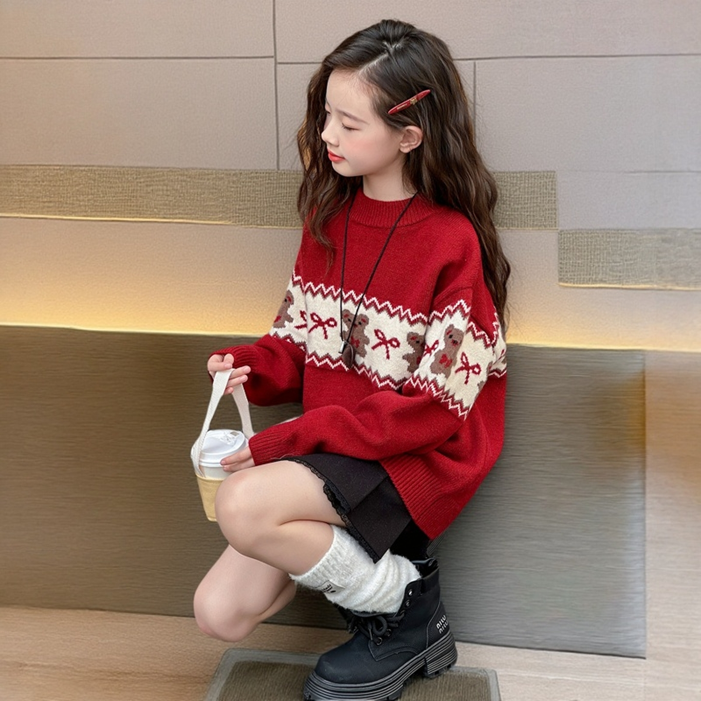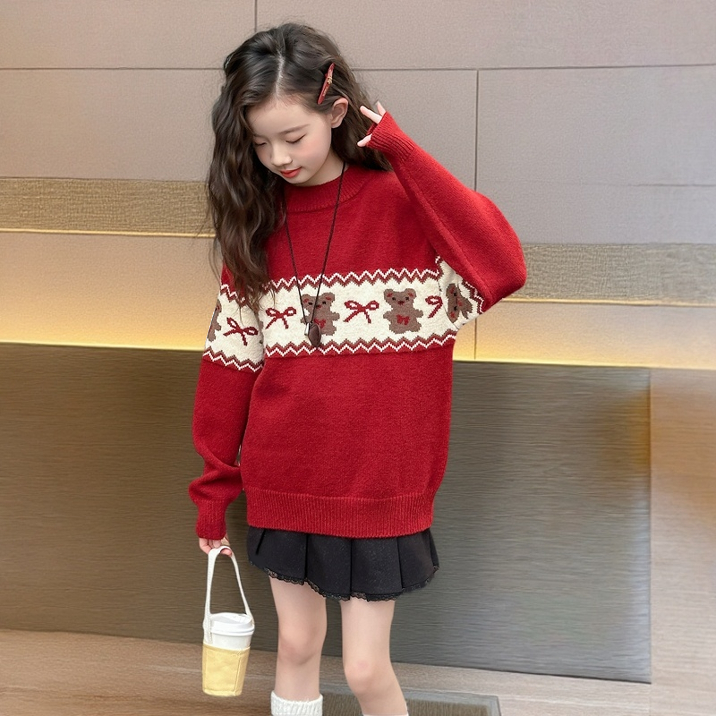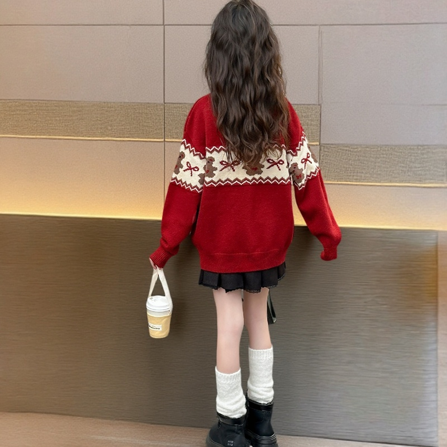 女童2025秋冬新款酷飒风中大童加厚卡通熊毛衣毛呢半身百褶裙套装