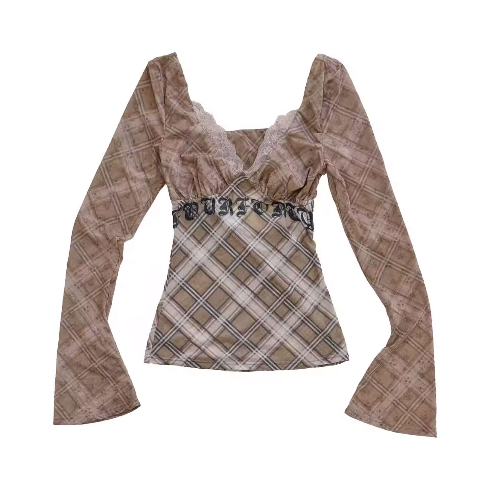 FOURFORTY EYES PLAID TOP 韩里韩气 格纹蕾丝网纱长袖打底上衣