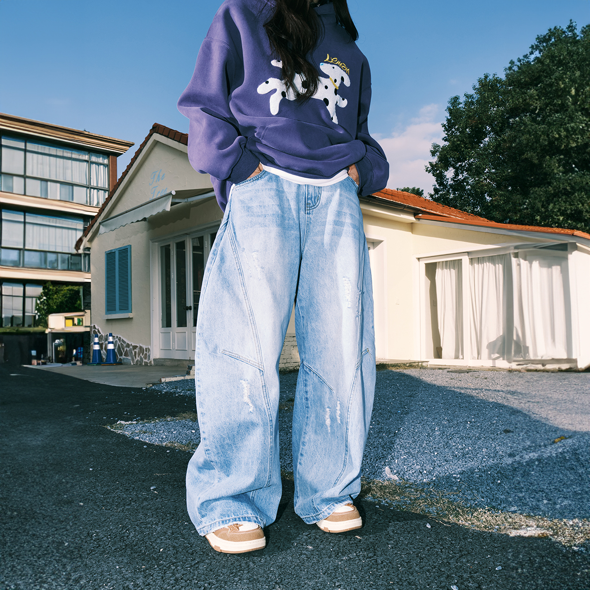 lemanism美式拼接破洞牛仔裤男宽松直筒裤子潮牌情侣款休闲长裤女