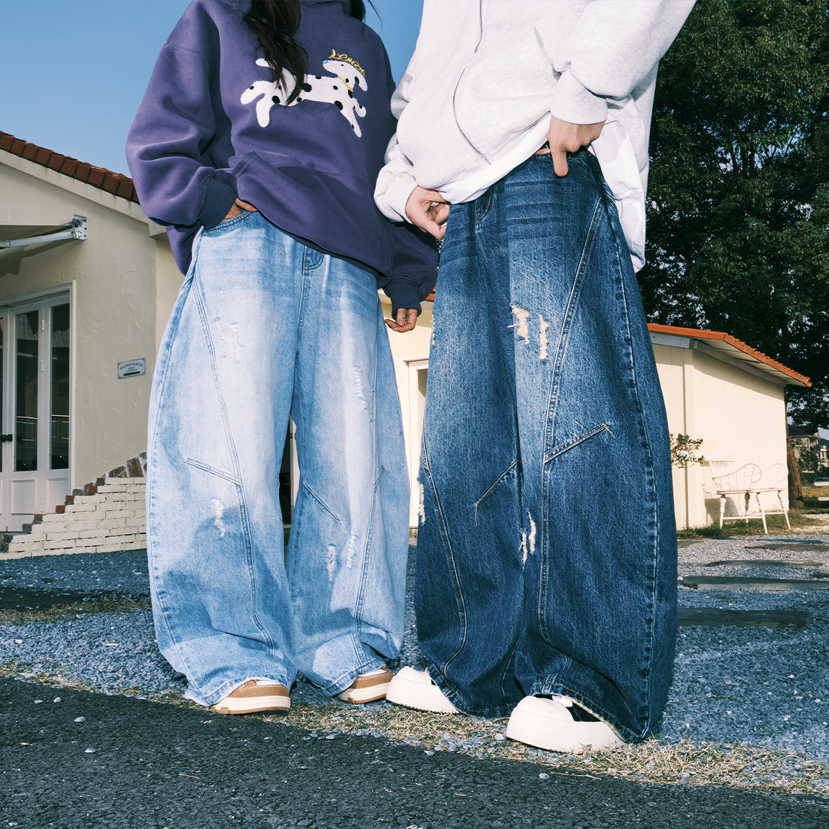 美式拼接破洞牛仔裤男宽松直筒